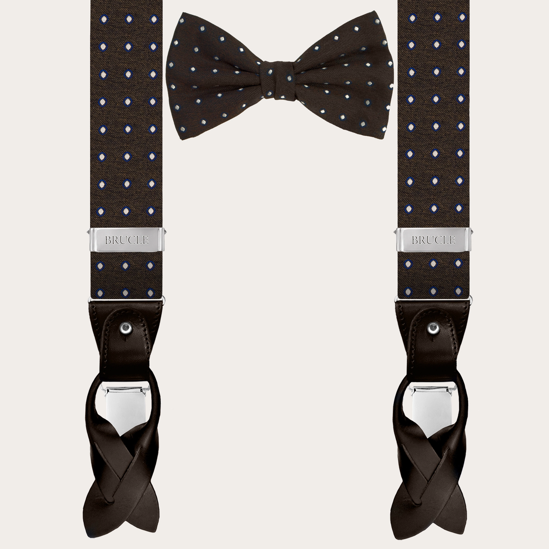 Paket bestehend aus Hosenträgern und Fliege braun in origineller Variante des klassischen Punktmusters. 100% Made in Italien.