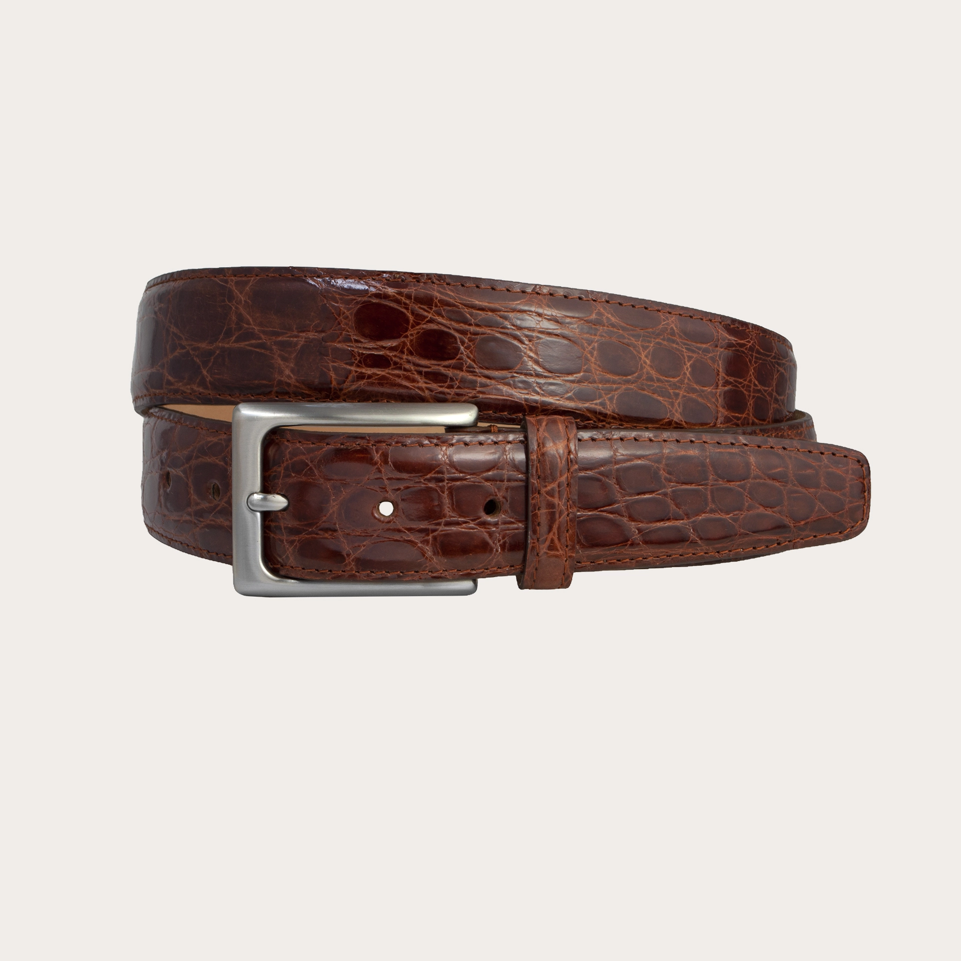 Herrengürtel aus echtem Krokodil mit der Seite, dem wertvollsten Teil. Überraschend und einfach zu kombinieren in Holzbraun, einer warmen Farbe, die das Leder aufwertet, und mit den besten Materialien für Futter und Schnalle veredelt.