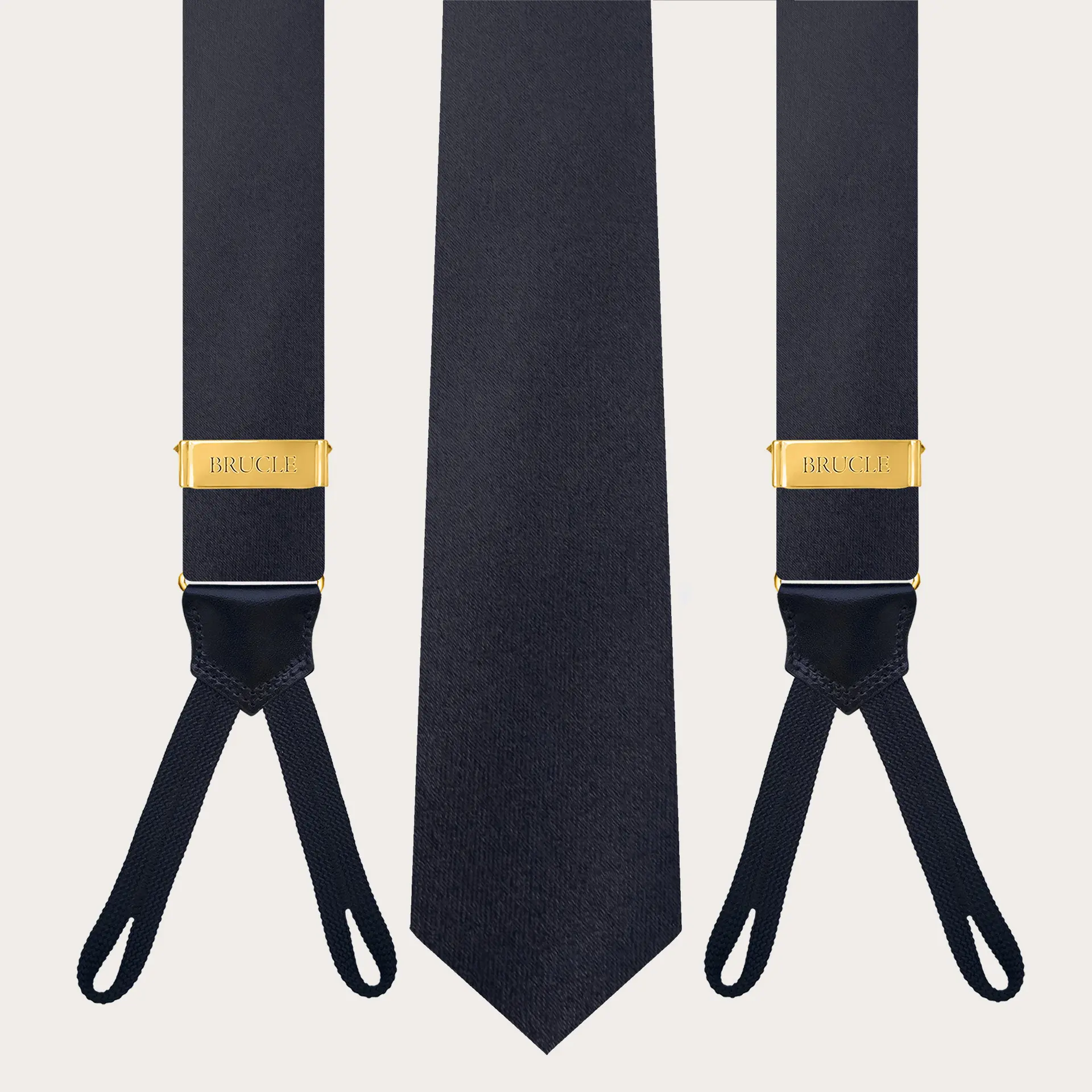 This coordinated set embodies the essence of Italian artisanal luxury, combining refined elegance and tailoring expertise. Comprising suspenders in navy blue silk satin with gold adjusters for buttons and a classic tie three-fold wide 8 cm, every element is meticulously detailed.