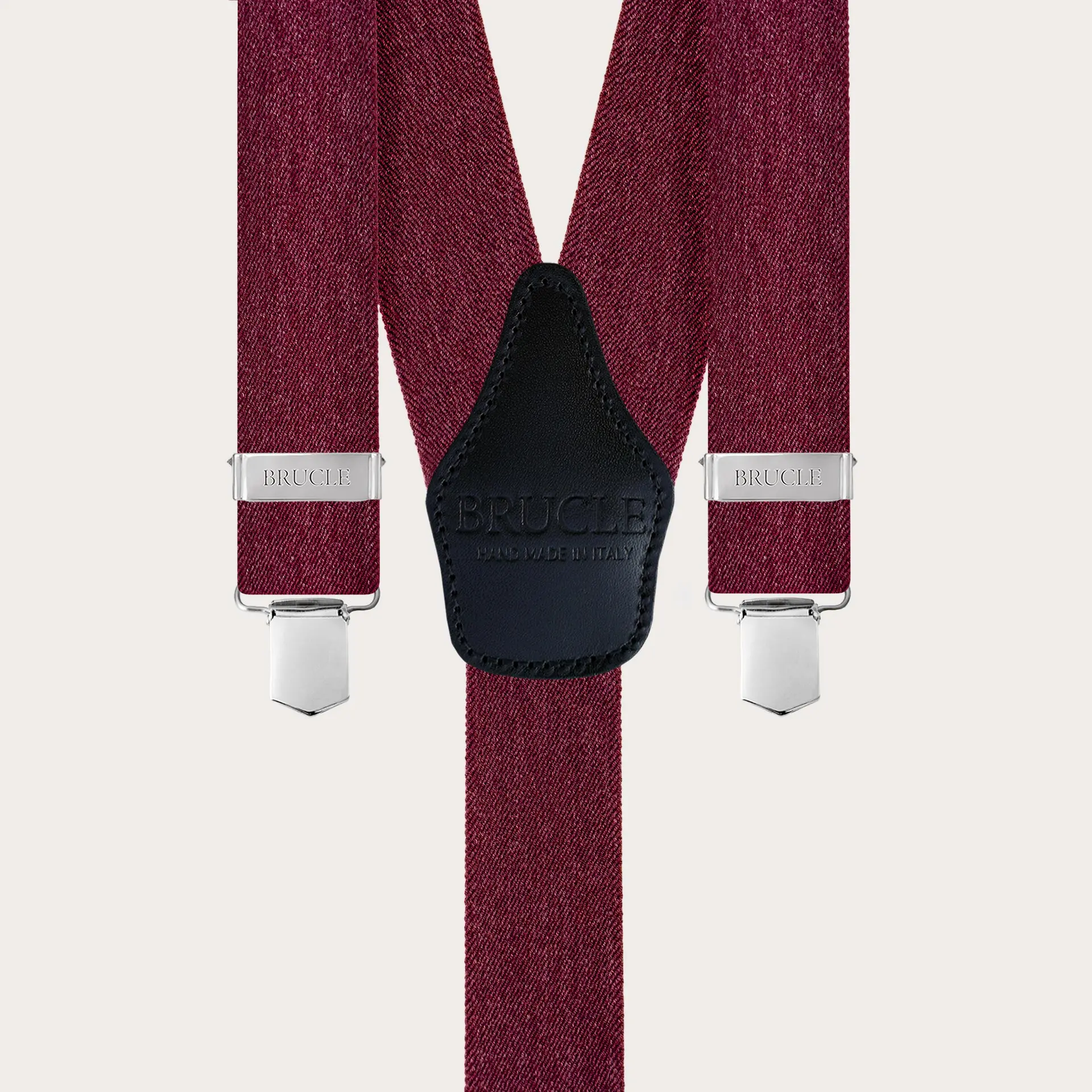 Wide Y-shaped burgundy suspenders with a jeans effect