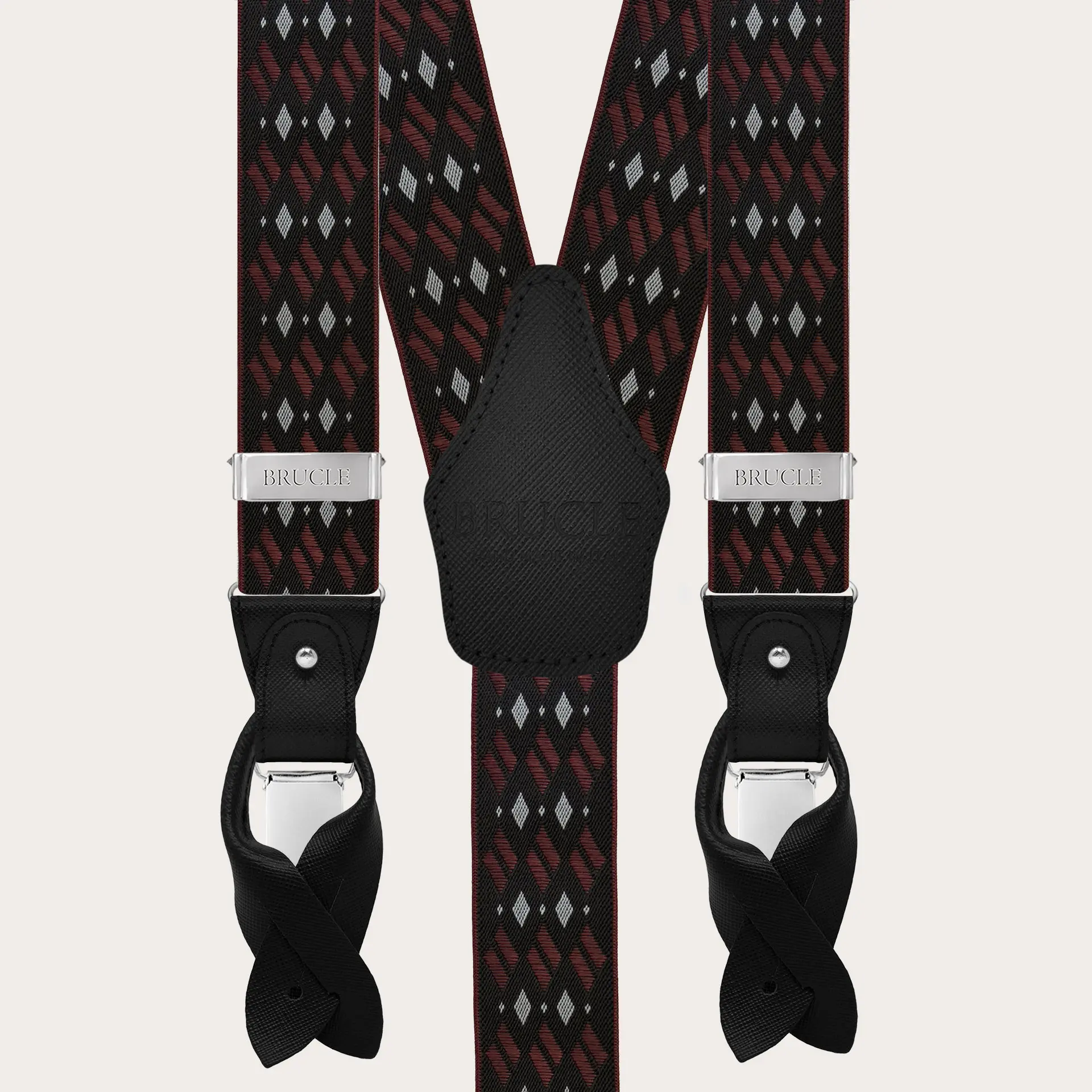 Elegant men's suspenders with an exclusive black and burgundy diamond pattern to be used with leather button ends, or with practical clips. A classic suspender model, easy to match with any outfit, handcrafted with the finest materials and all metal parts are nickel free.