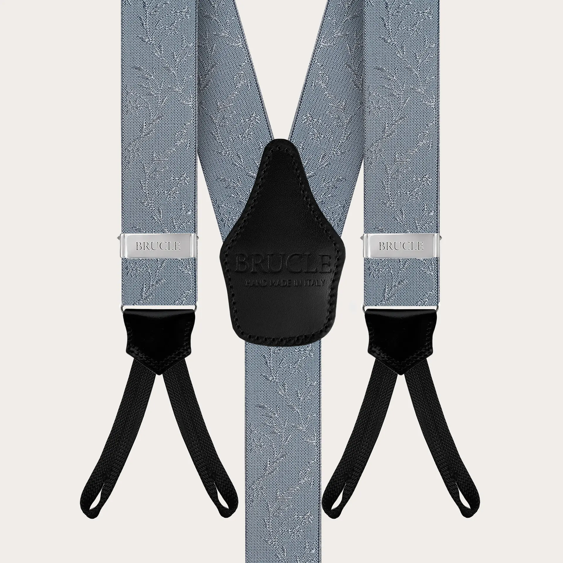 Elegant suspenders for ceremonies in a refined powder blue color embellished with a pearl-colored floral pattern. An elegant and refined model, to be worn exclusively with buttons. Customizable with engravings, they are entirely handmade in Italy with the finest materials. Discover also the coordinated silk accessories for a unique total look.
