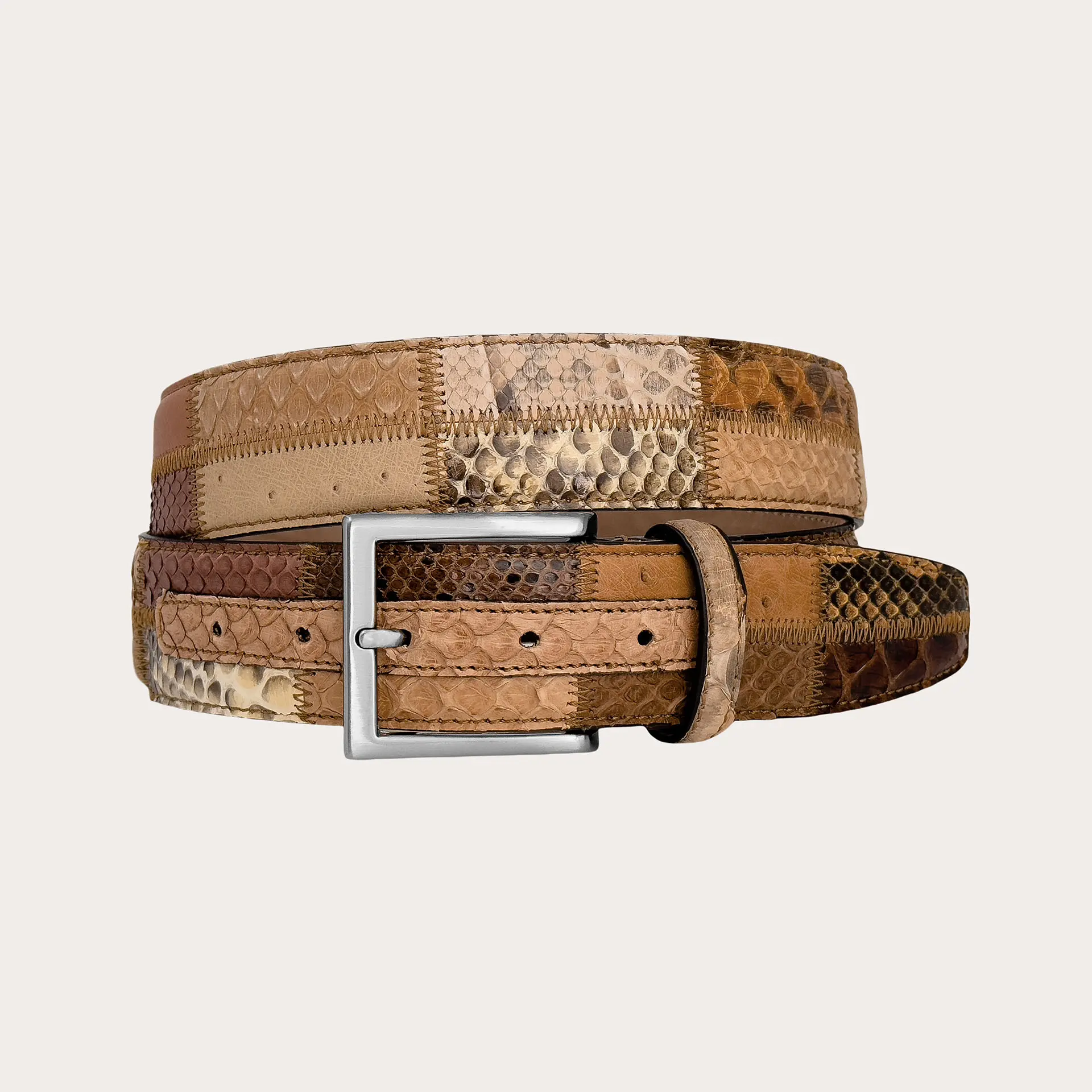 Genuine Python Belt with a 4 cm height, crafted in a patchwork design in tan and cognac tones.