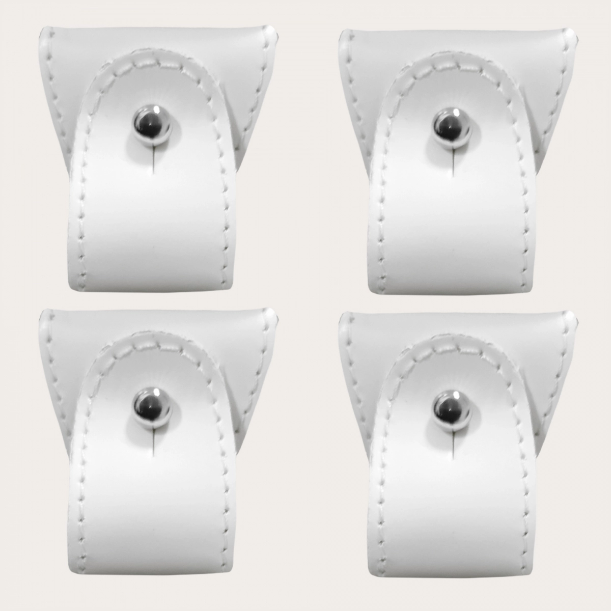 Set of white leather terminals for double use convertible suspenders with clips and buttons. For versatile suspenders that can be adapted to different looks. Designed for those who want to change the color of their leather accessories and create unique combinations. Collect them in different colors and combine them to make your suspenders always different.