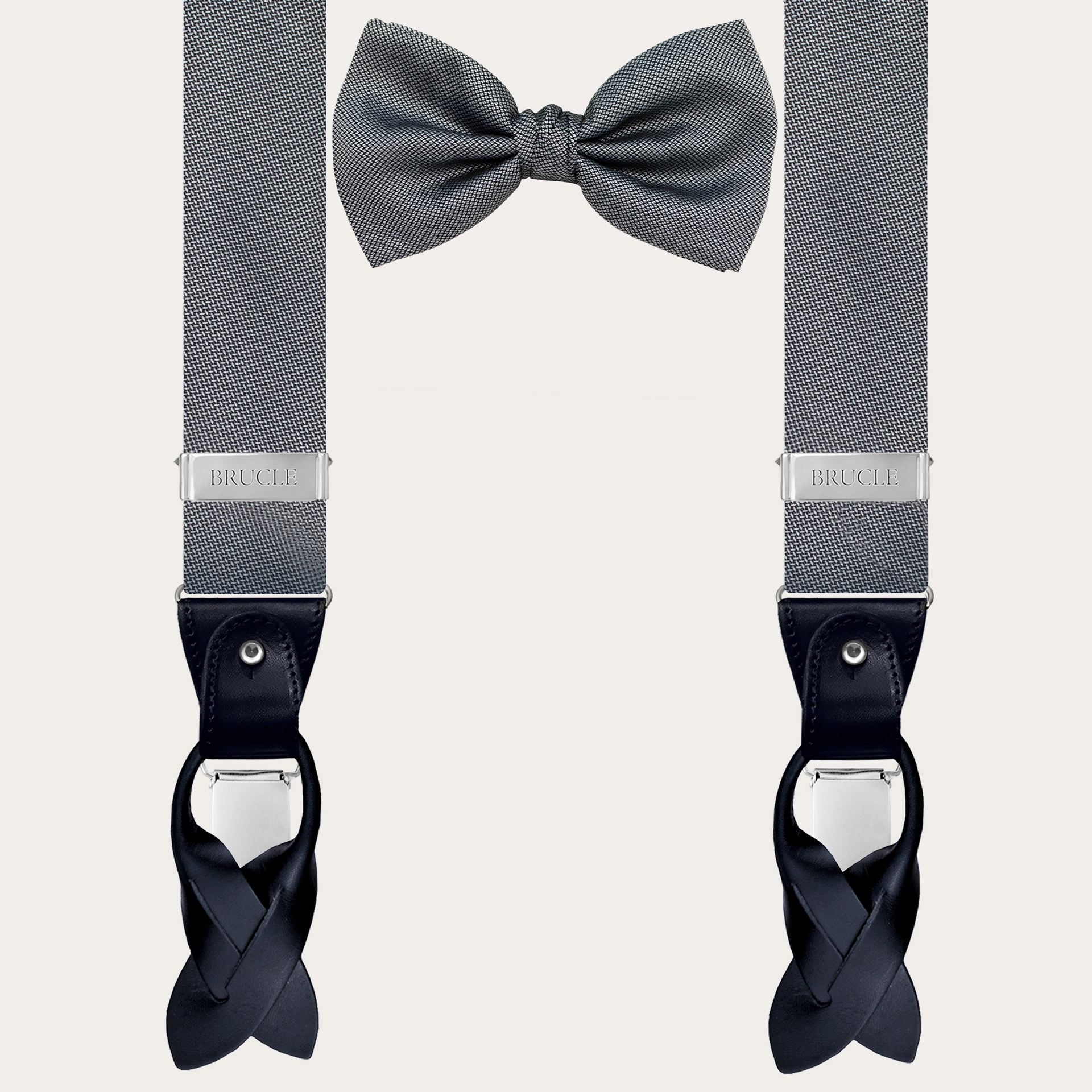 Conjunto coordinado de tirantes doble uso y pajarita en elegante seda gris. Un juego completamente libre de níquel y 100% Made in Italy.