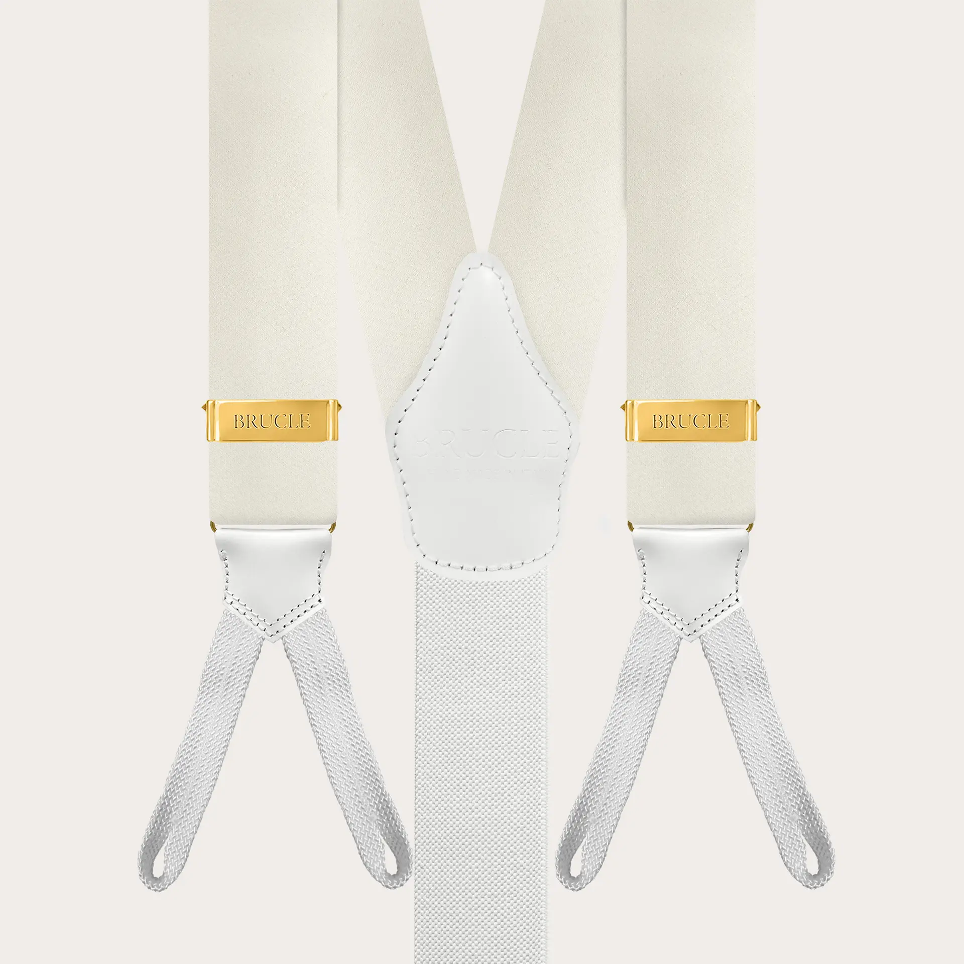Tirantes de ceremonia en satén de seda blanco con ojales para botones, embellecidos con piezas metálicas doradas que confieren a estos tirantes artesanales un aspecto lujoso y precioso.