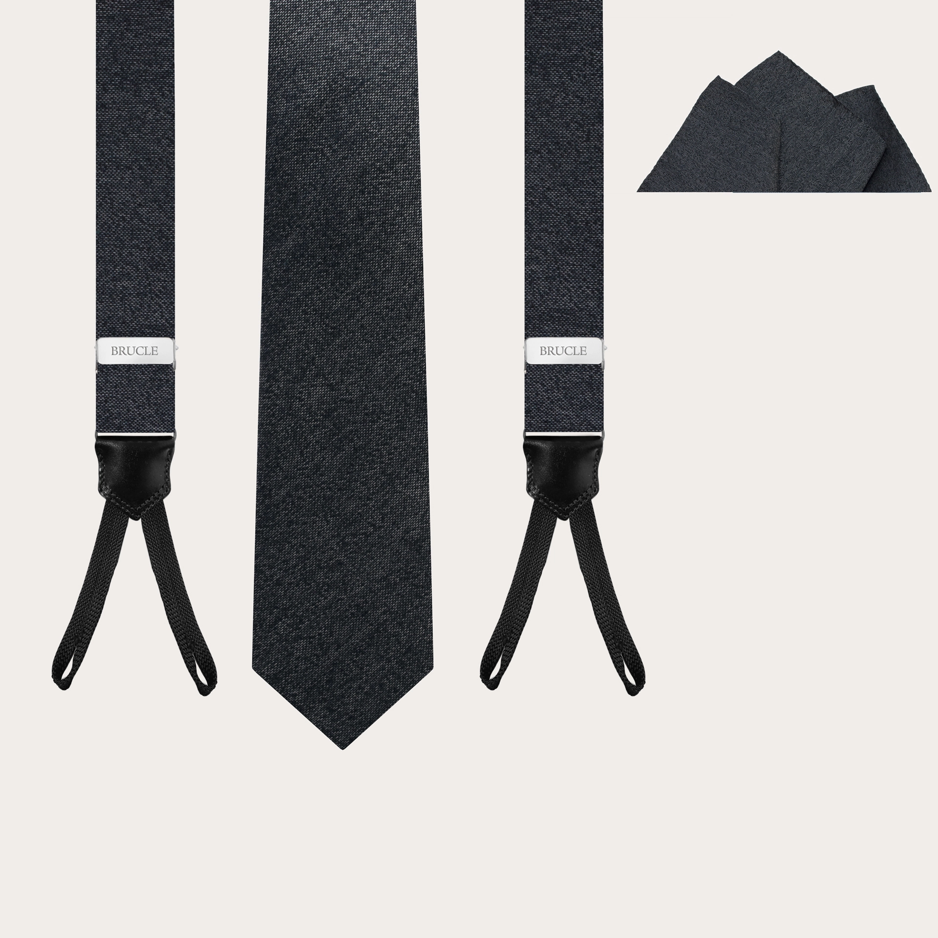 Ensemble de bretelles gris chiné avec boutonnières, pochette et cravate