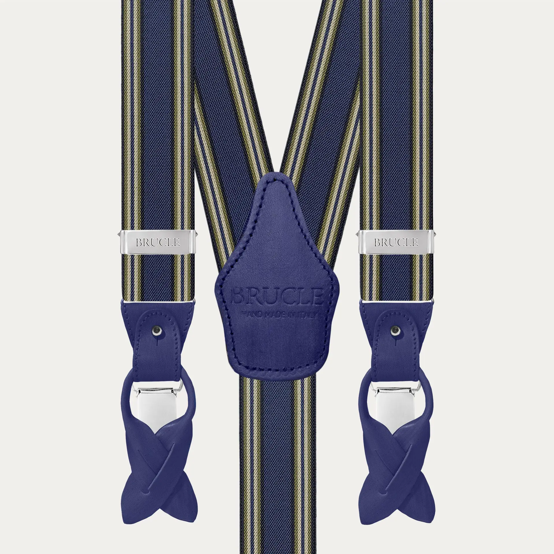Originales bretelles pour hommes à motif rayé, bleu avec de micro-rayures beige et vertes, et parties en cuir véritable coloré à la main. Un modèle de la nouvelle collection avec un style exclusif et unique, parfait pour un style raffiné et élégant. Grâce aux devants ouvrables, ces bretelles peuvent être portées avec des boutons cousus sur le pantalon (non inclus mais disponibles à l'achat dans notre boutique en ligne dans la catégorie pièces et accessoires pour bretelles) ou avec des clips, pour un style plus pratique. Les bretelles bleues à rayures sont également personnalisables avec des gravures d'initiales sur les parties en cuir et les clips, et sont un accessoire de mode artisanal 100% fait main en Italie avec les meilleurs matériaux.
