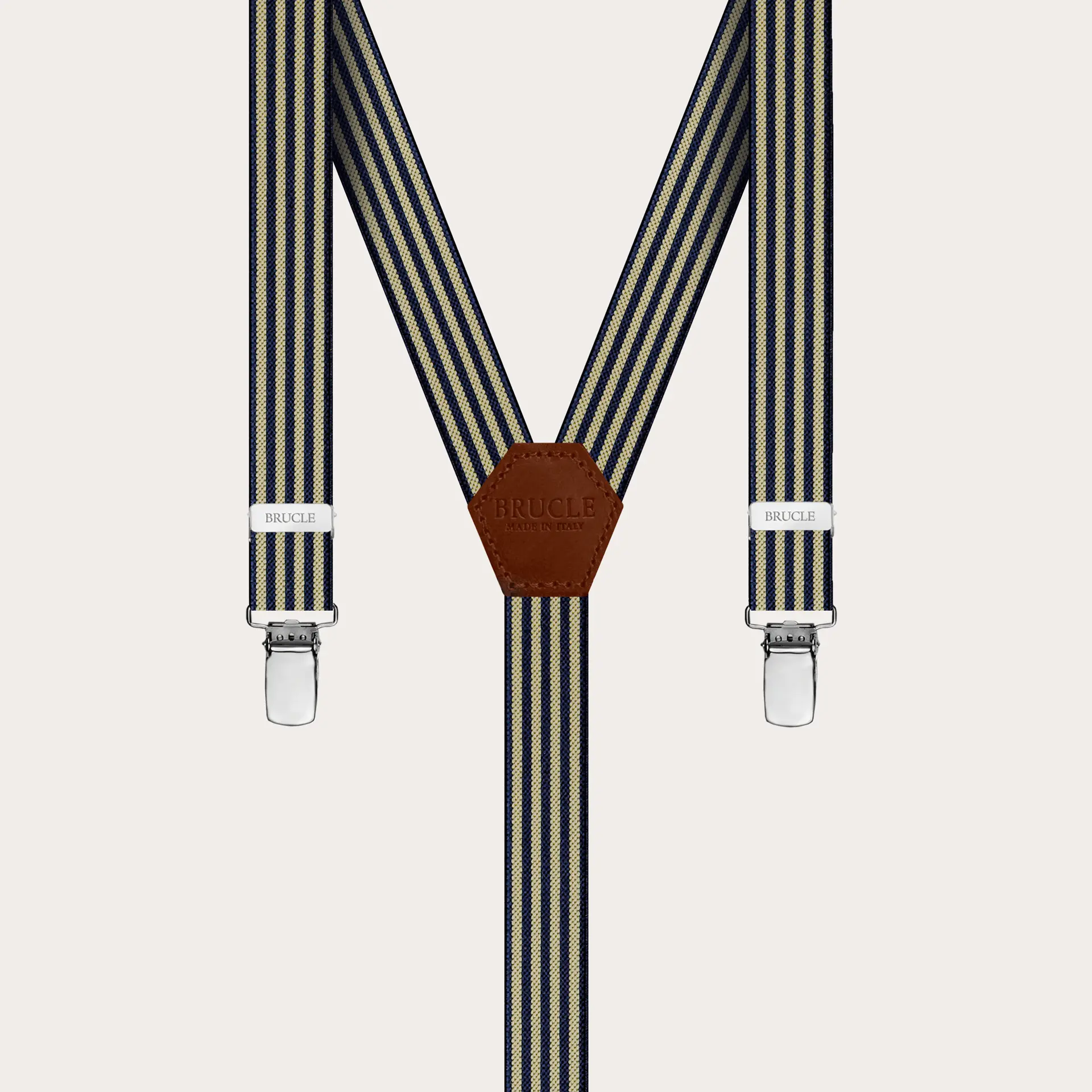 Bretelles élégantes en forme de Y pour hommes et femmes avec motif rayé, bleu et jaune