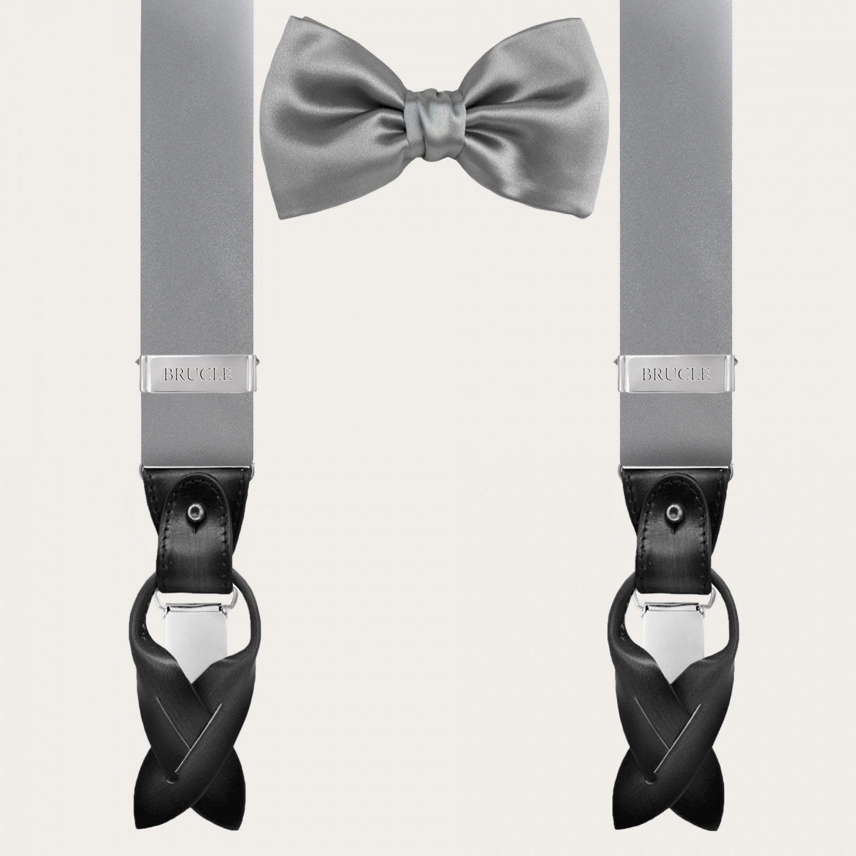 Pacchetto composto da bretelle e papillon in raso di seta grigio.