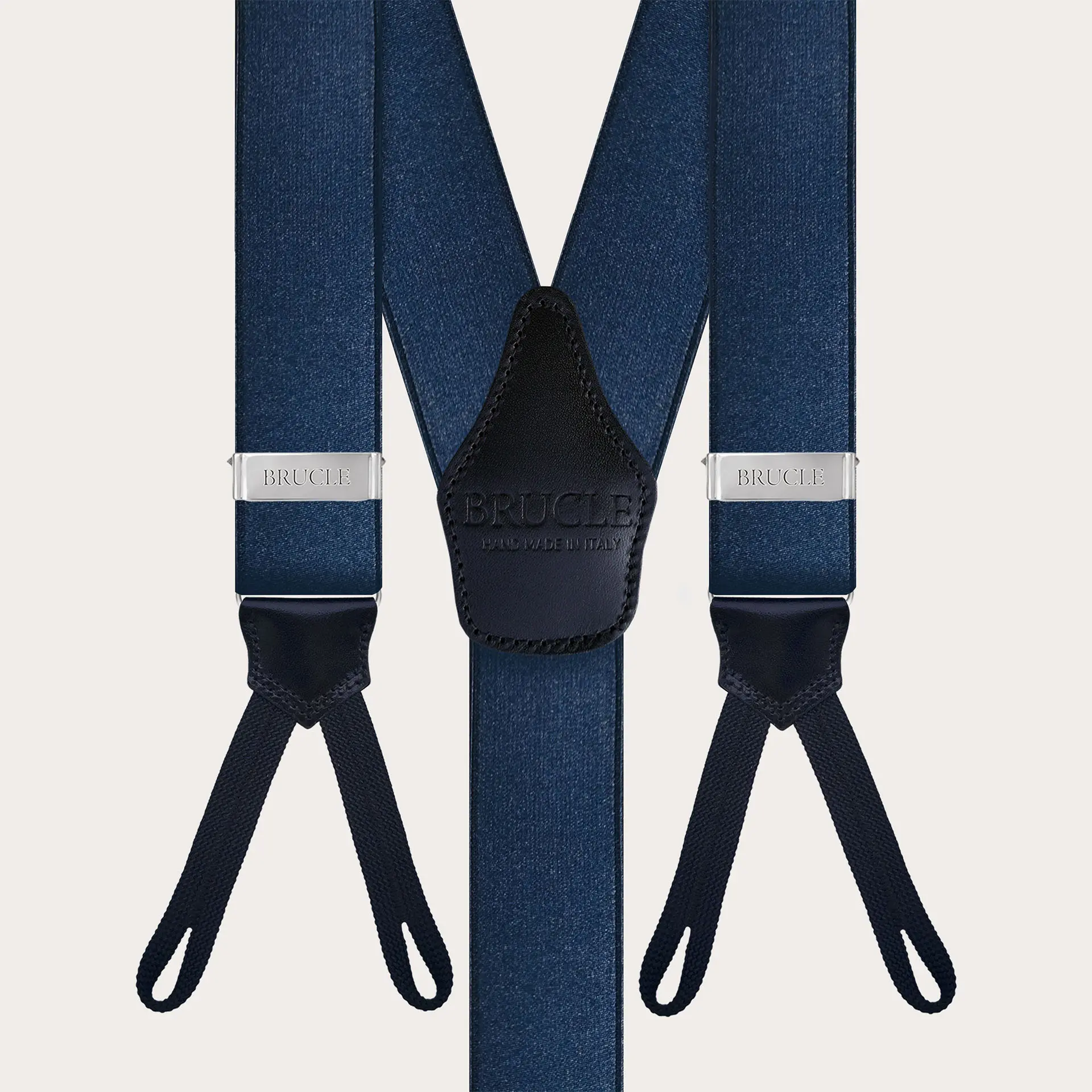 Eleganti bretelle uomo in raso elastico blu con asole per bottoni. Fatte a mano in Italia con materiali di alta qualità e parti in vera pelle tono su tono. Il caldo tono di blu che contraddistingue queste bretelle è facile da abbinare, ed è perfetto per cerimonie ed occasioni formali. Perfette anche come regalo, puoi renderle uniche personalizzando i terminali in pelle con le tue iniziali.