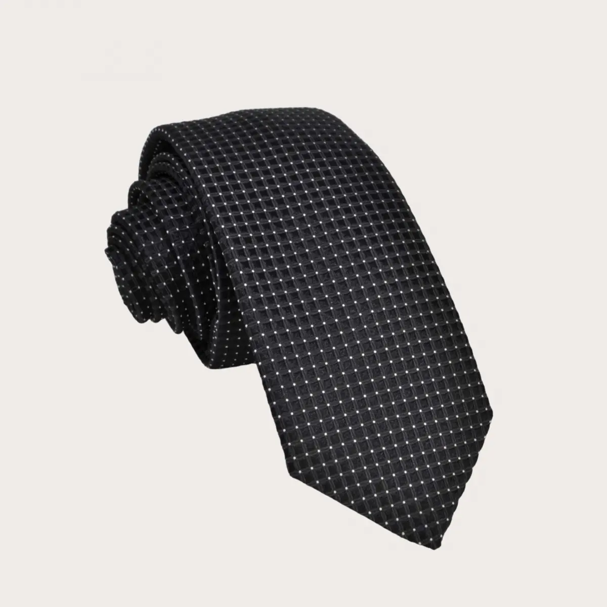 Scopri la cravatta nera puntaspillo stretta in seta, una sorprendente cravatta uomo cerimonia di alta qualità, realizzata artigianalmente per offrire un tocco di stile e raffinatezza a qualsiasi outfit elegante.