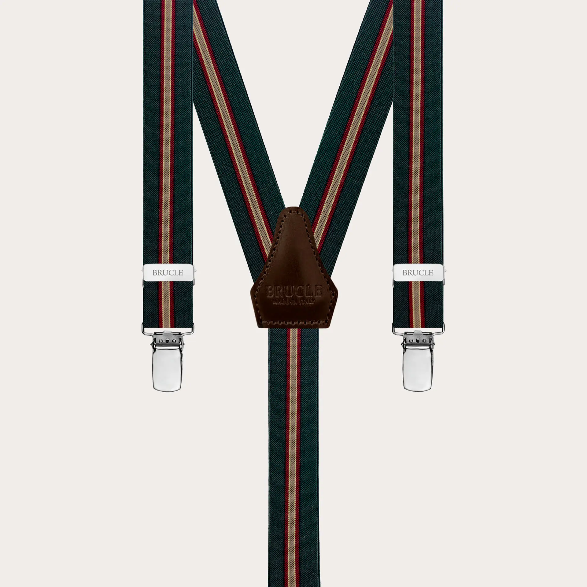 Bretelle regimental verdi con fissaggio solo a clip in elastico stretto. Una fantasia originale che reinterpreta il classico regimental. Versatile e facile da abbinare, è disponibile in diverse varianti colore. Un modello di bretella unisex, personalizzabile con incisioni sulle clip. Scopri tutta la collezione di bretelle uomo e bretelle donna Brucle.