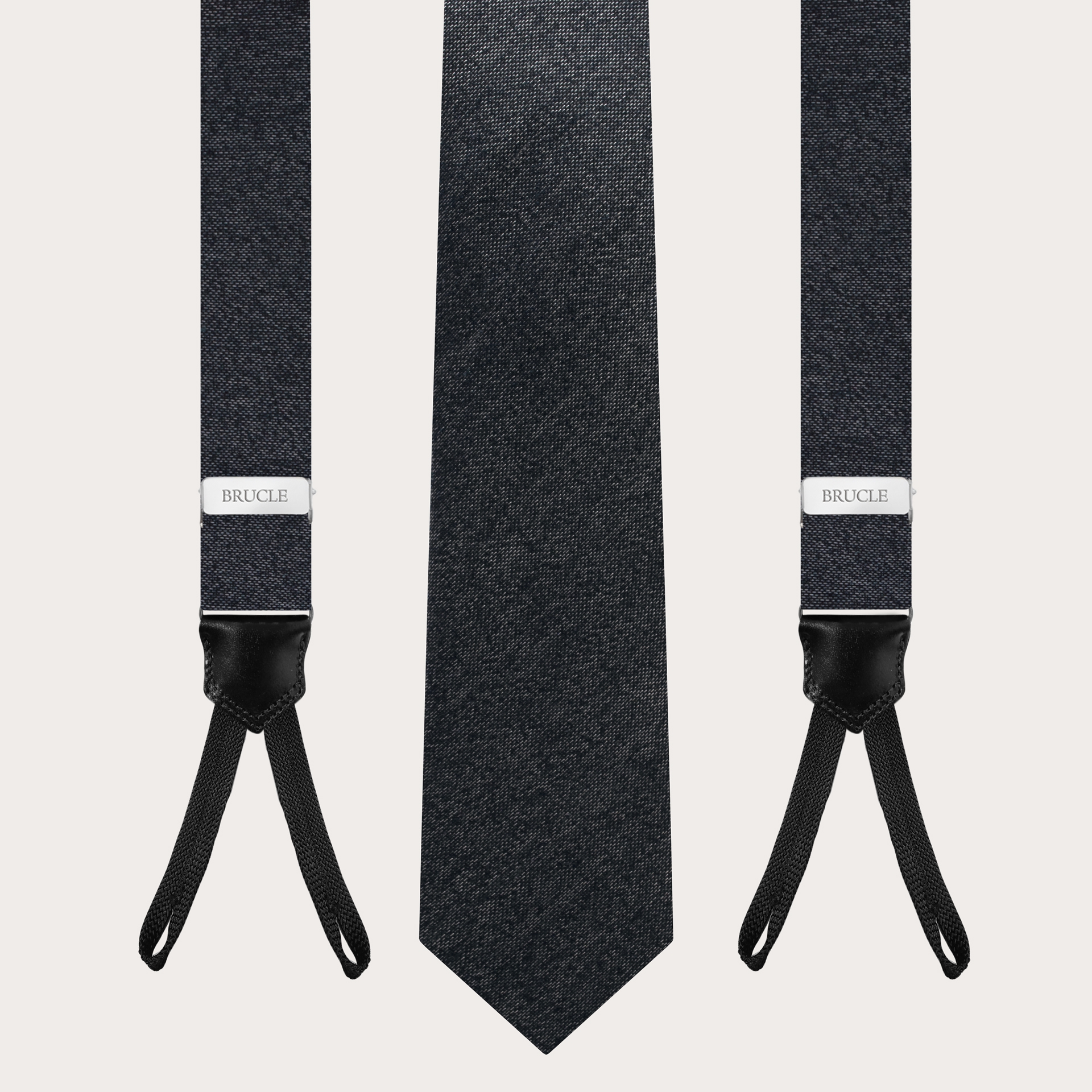 Edles Herren-Set aus dünnen Hosenträgern mit Knopflöchern und Krawatte, grau meliert