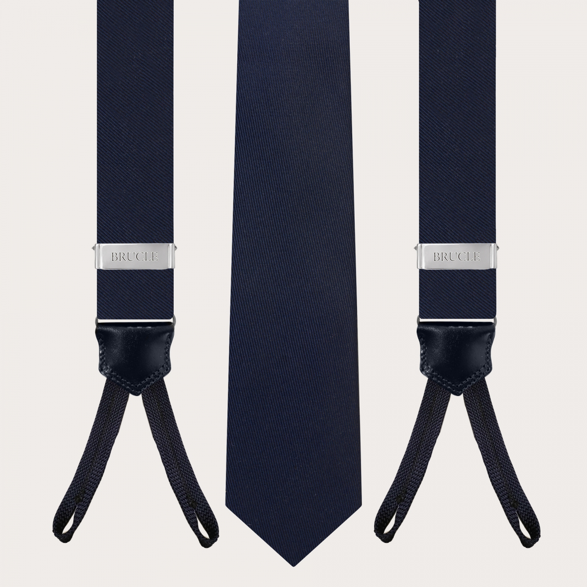 Hosenträger mit Knopflöchern und Krawattenset aus blauer Seide
