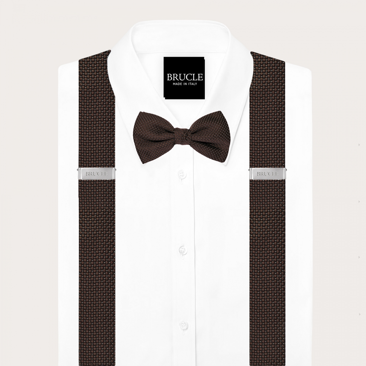 Set aus Hosenträgern und Krawatte aus brauner Nadelpunkt-Seide, elegant und raffiniert, handgefertigt in Italien.
