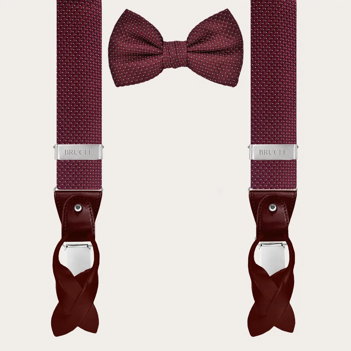 Originales Set aus bordeauxfarbener Seide mit Punktmuster, bestehend aus breiten Hosenträgern für Knöpfe oder Clips und einer vorgebundenen Fliege aus derselben Seide. Ein eleganter Bordeauxton und ein Diamantmuster verleihen diesem exklusiven Seiden-Accessoire-Set Raffinesse.