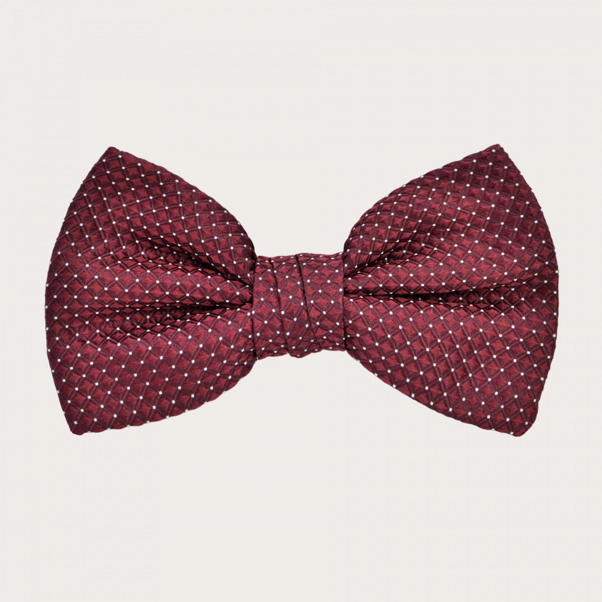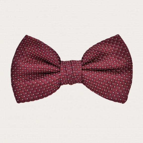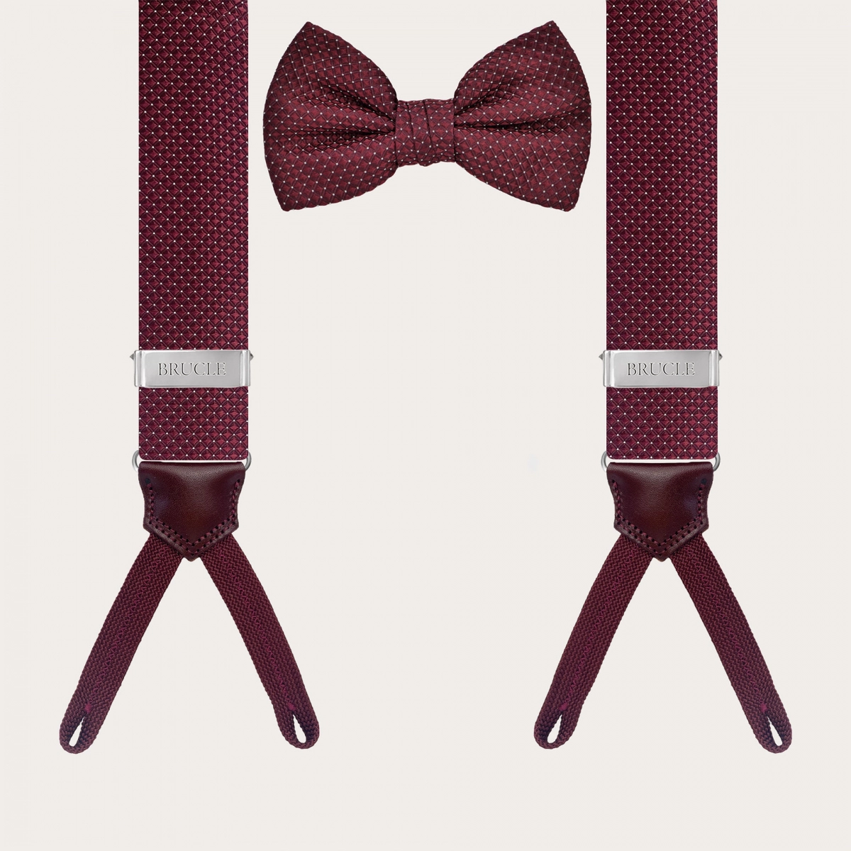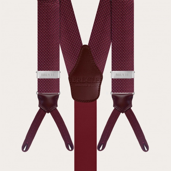 Exklusives koordiniertes Seidenset mit einem bordeauxfarbenen Nadelpunktmuster, bestehend aus breiten Hosenträgern mit Knopflöchern und einer vorgebundenen Fliege aus derselben edlen Seide.
