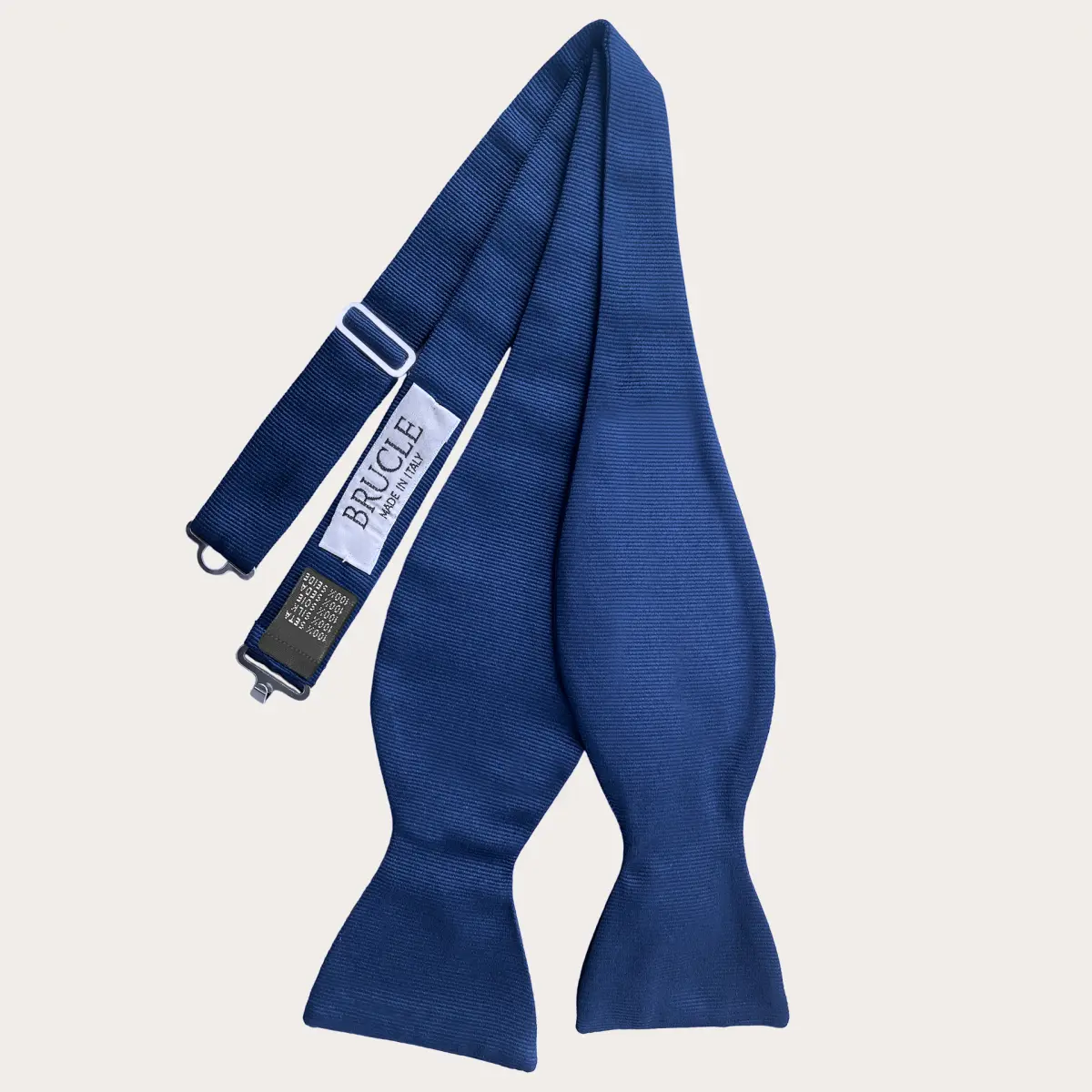 Die blaue selbstgebundene Seidenschleife von Brucle ist ein zeitloses Accessoire, das für Männer entworfen wurde, die hochwertige Handwerkskunst und einen markanten Stil erkennen und schätzen. Diese Fliege verkörpert ein wahres Beispiel für italienische Handwerkskunst, bei der jedes Detail sorgfältig gepflegt wird und die ständige Hingabe zur Qualität widerspiegelt, ein Markenzeichen des "made in Italy".