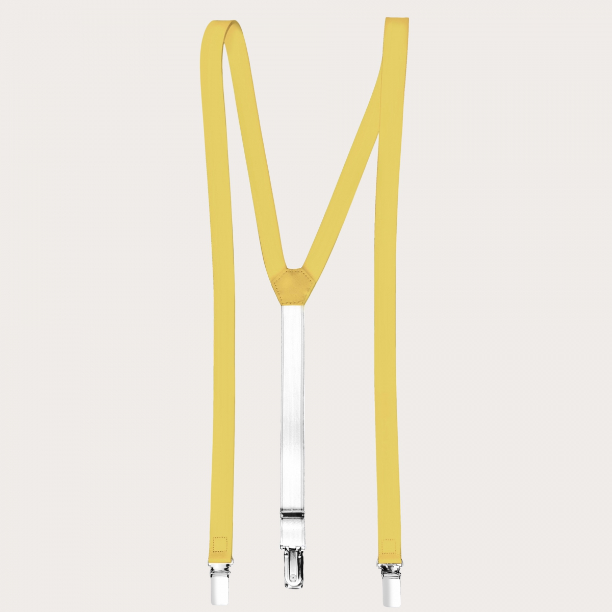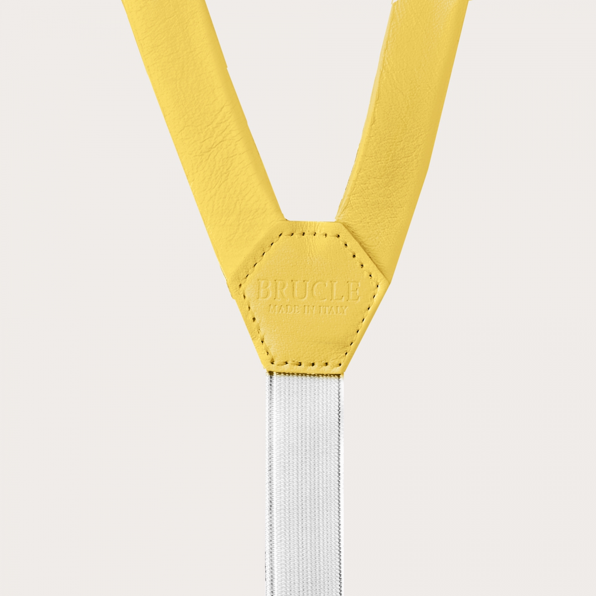 Hosenträger in Y-Form aus gelbem Leder. Elegante Hosenträger, die zu jeder Art von Outfit getragen werden können, von lässig schick bis zu den formellsten und elegantesten.