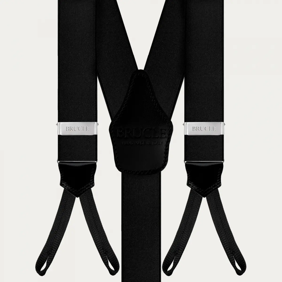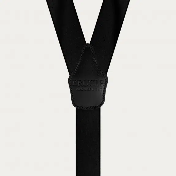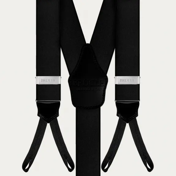 Elegante, breite Hosenträger aus schwarzem elastischem Satin mit Knopflochbefestigung. Diese handgefertigten Hosenträger sind 100% handgefertigt in Italien mit den besten Materialien und mit Liebe zum Detail. Eine klassische Farbe, die leicht zu kombinieren ist, perfekt für Zeremonien, Smokings und Veranstaltungen.