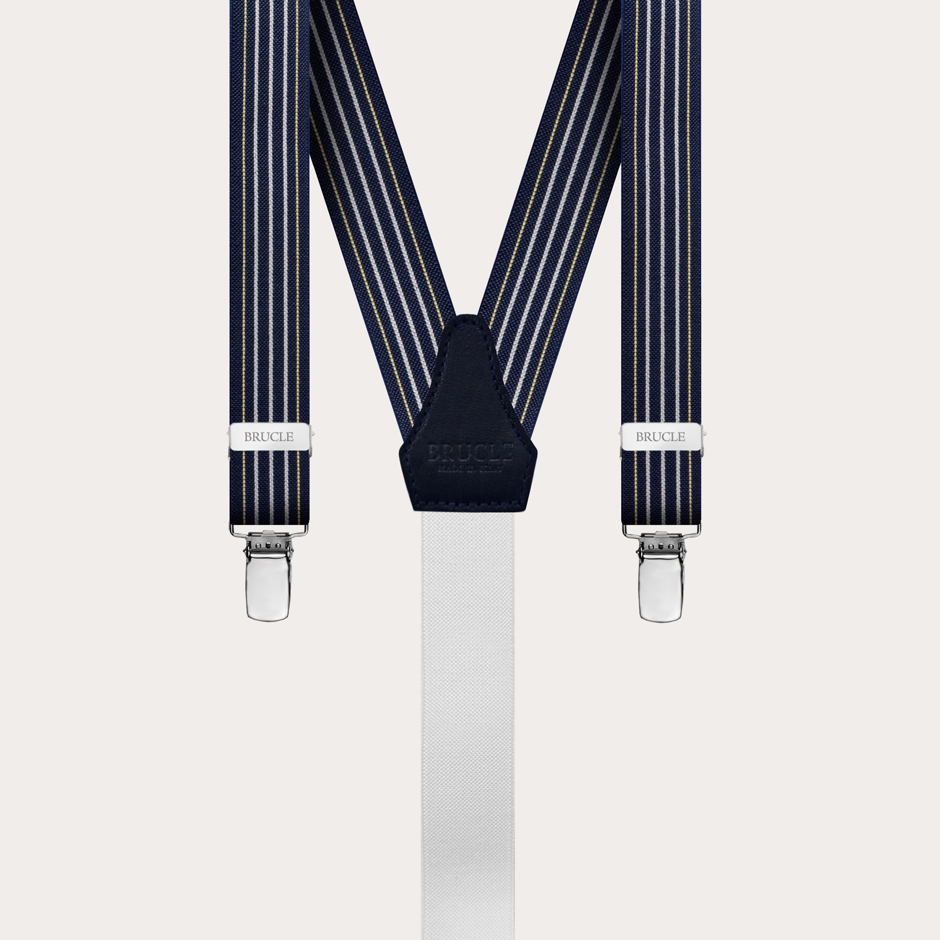 Elegantes Modell von Hosenträgern mit Streifenmuster, bei dem die marineblaue Farbe einen raffinierten Kontrast in den dünnen weißen und gelben Streifen sieht.