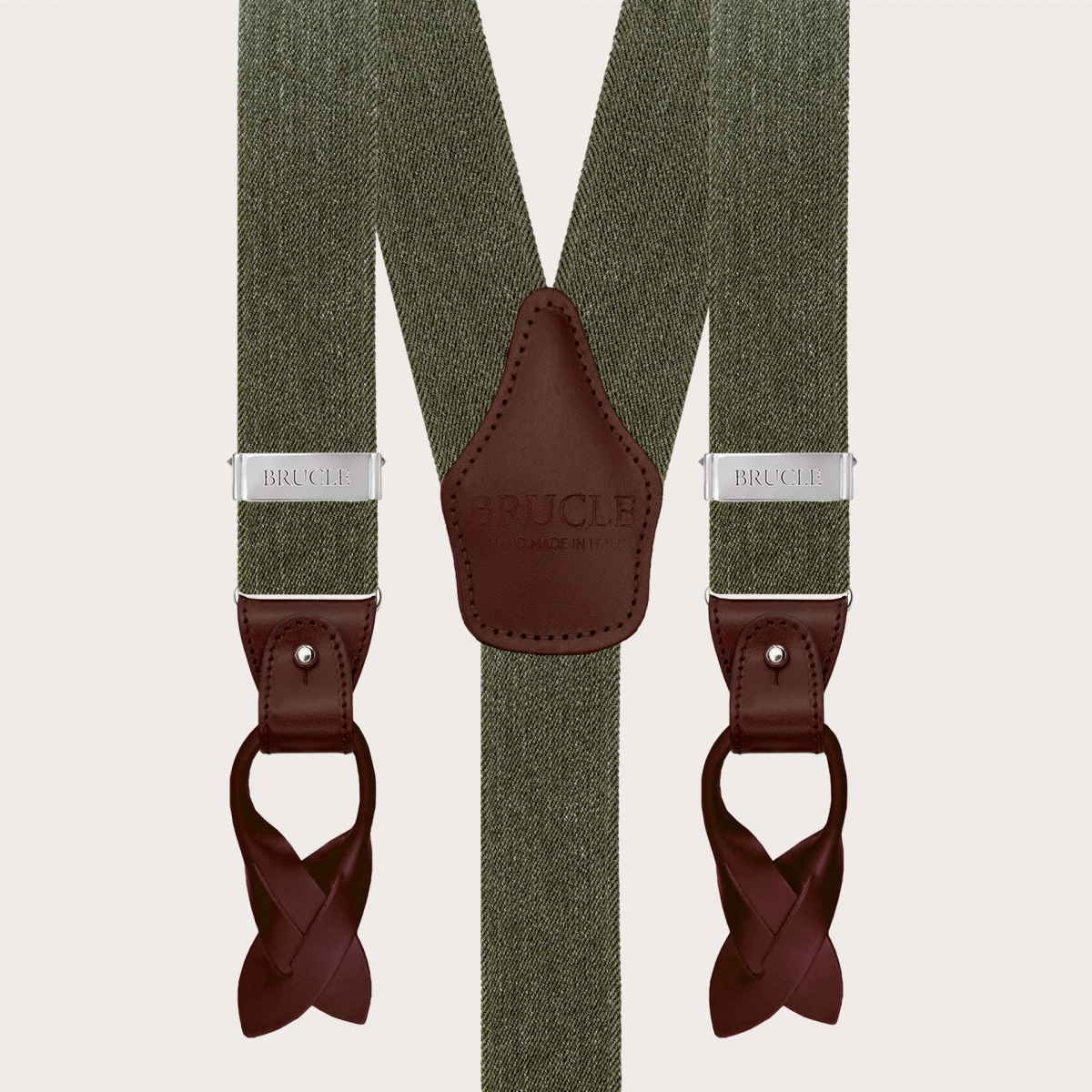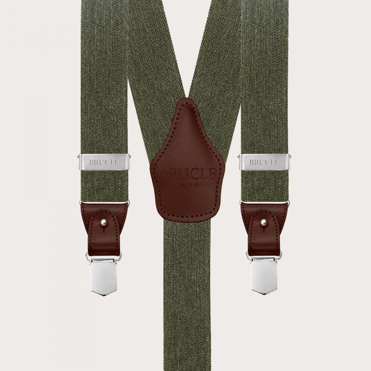 Elastische Hosenträger mit grünem Jeans-Effekt-Band. Dank ihrer Y-Form mit Doppelnutzung können sie mit Knöpfen oder Clips getragen werden, für einen raffinierteren oder praktischeren Stil.
