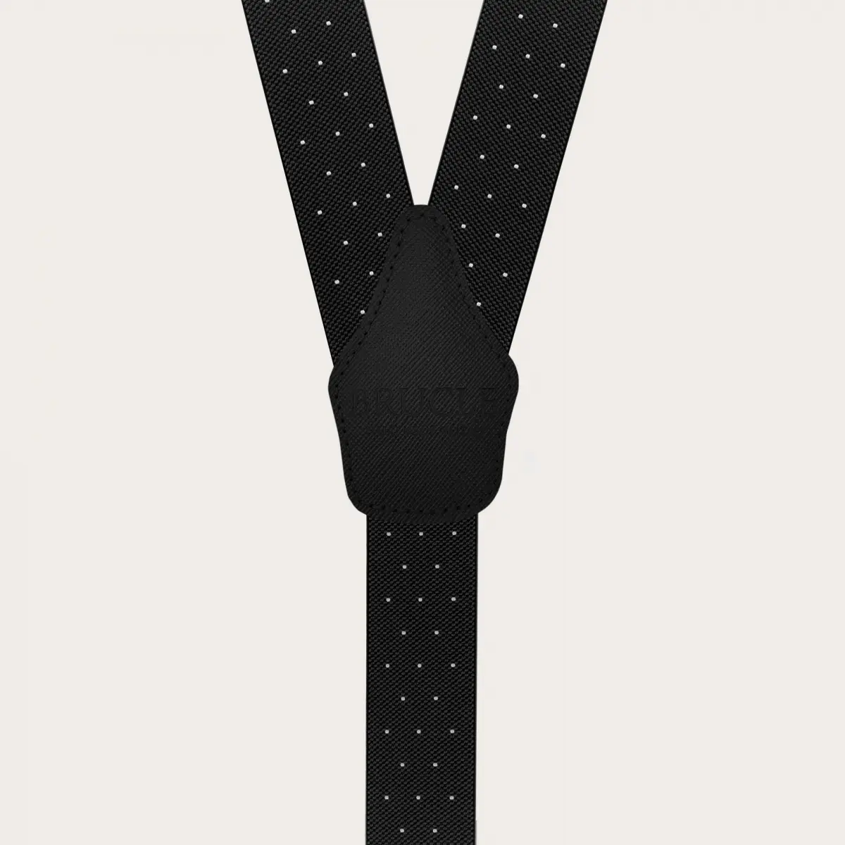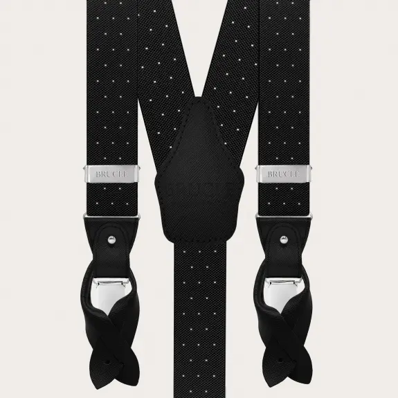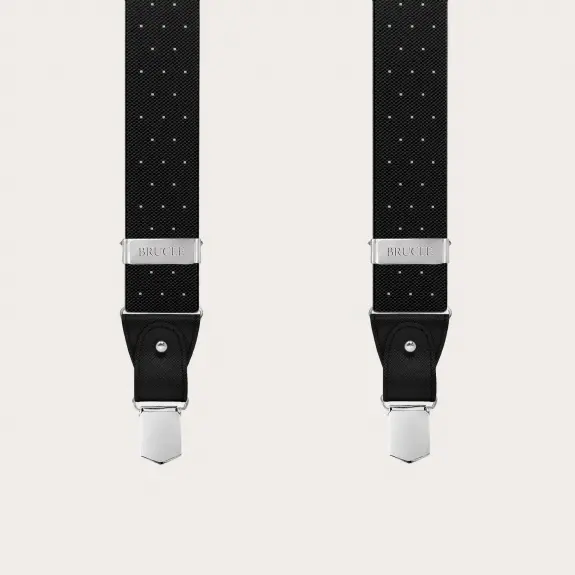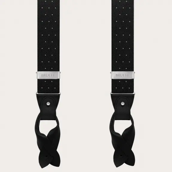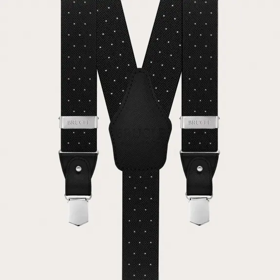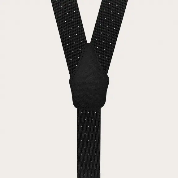 Elegante schwarze Hosenträger mit Punkten, veredelt mit Lederdetails in Saffiano-Prägung, die diesem zeitlosen Design eine besondere Note verleihen.