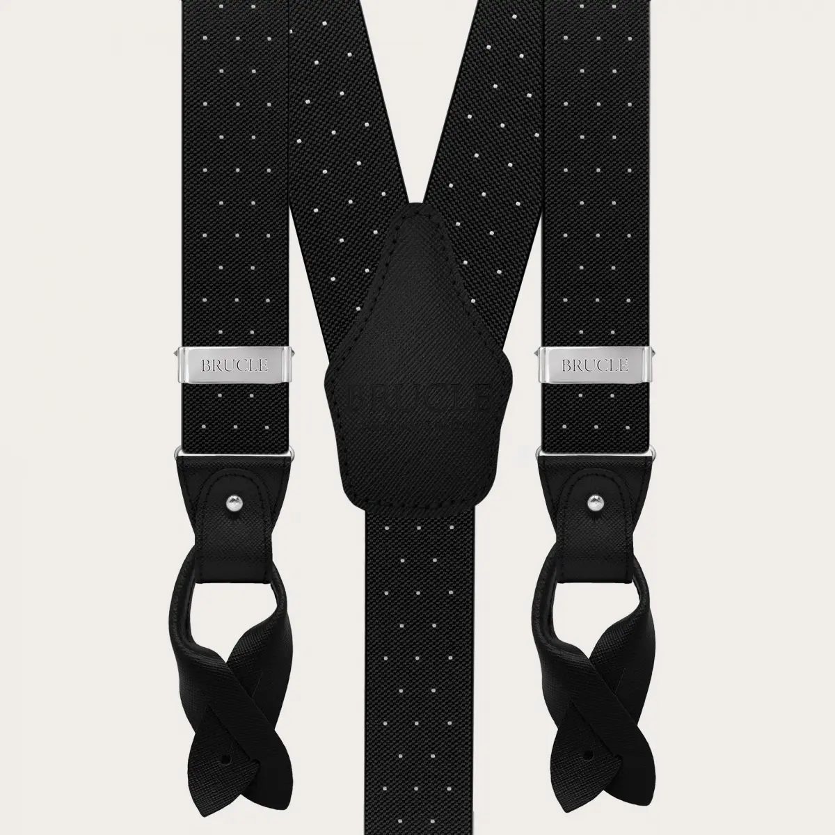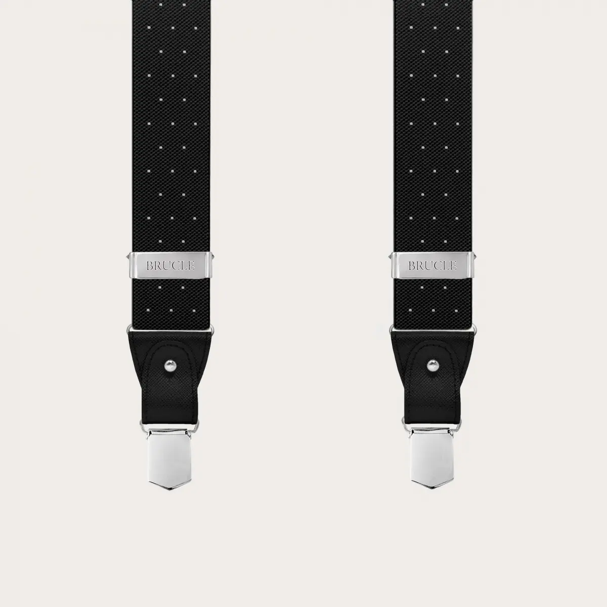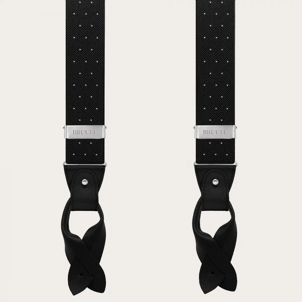 Elegante schwarze Hosenträger mit Punkten, veredelt mit Lederdetails in Saffiano-Prägung, die diesem zeitlosen Design eine besondere Note verleihen.