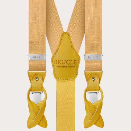 Die gelben Brucle Hosenträger repräsentieren die perfekte Kombination aus Tradition und Innovation, mit hervorragender Qualität, die nur echte italienische Handwerkskunst garantieren kann.