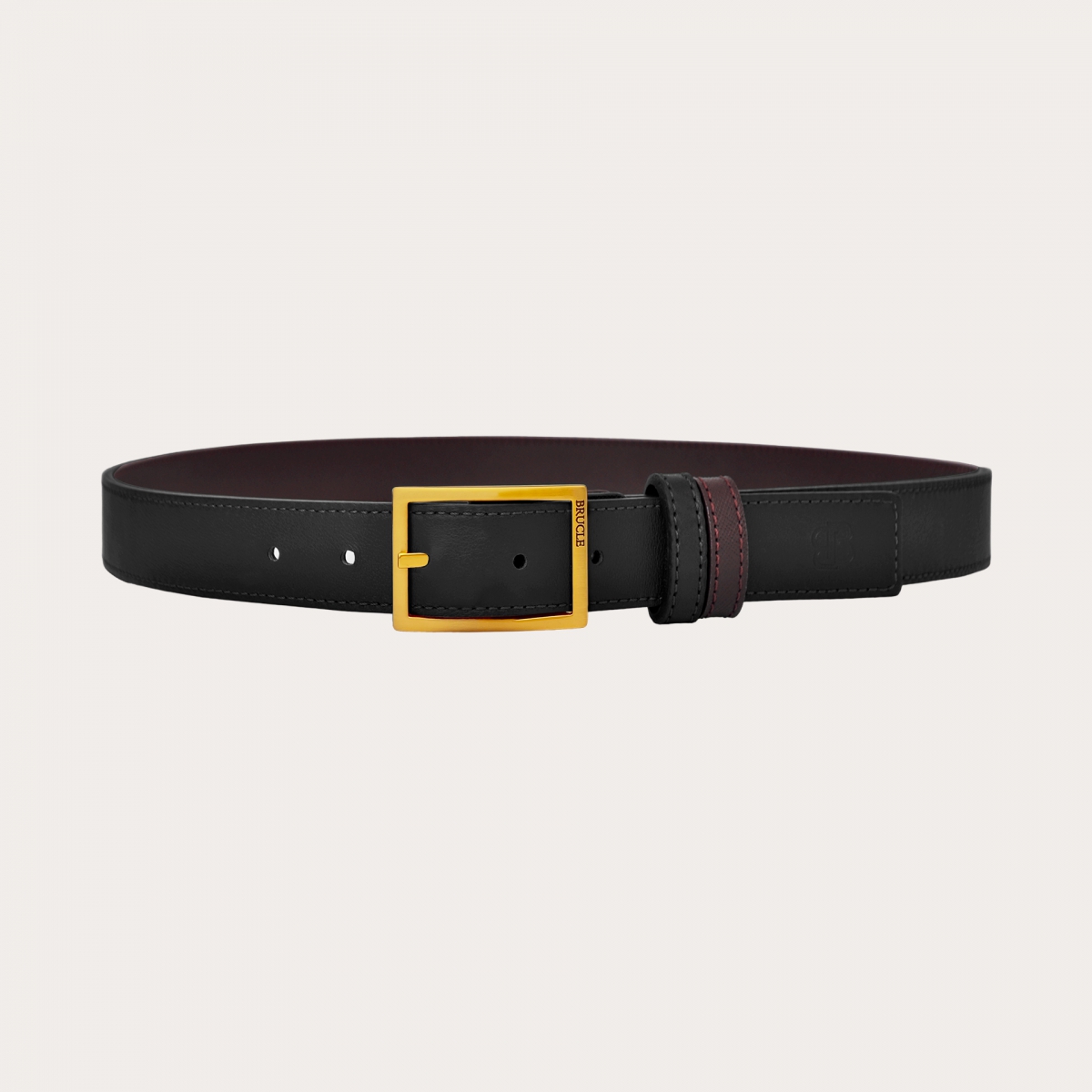 Wendbarer Doubleface-Gürtel mit burgund saffianoleder auf der einen Seite und schwarzer leder auf der anderen Seite. Mit doppelter nickelfreier Schließe, erhältlich in verschiedenen Ausführungen: Silber und golden. Das flache Modell mit quadratischer Spitze macht es zu einem modernen und trendigen Modell, die Farben machen es für jede Jahreszeit geeignet.