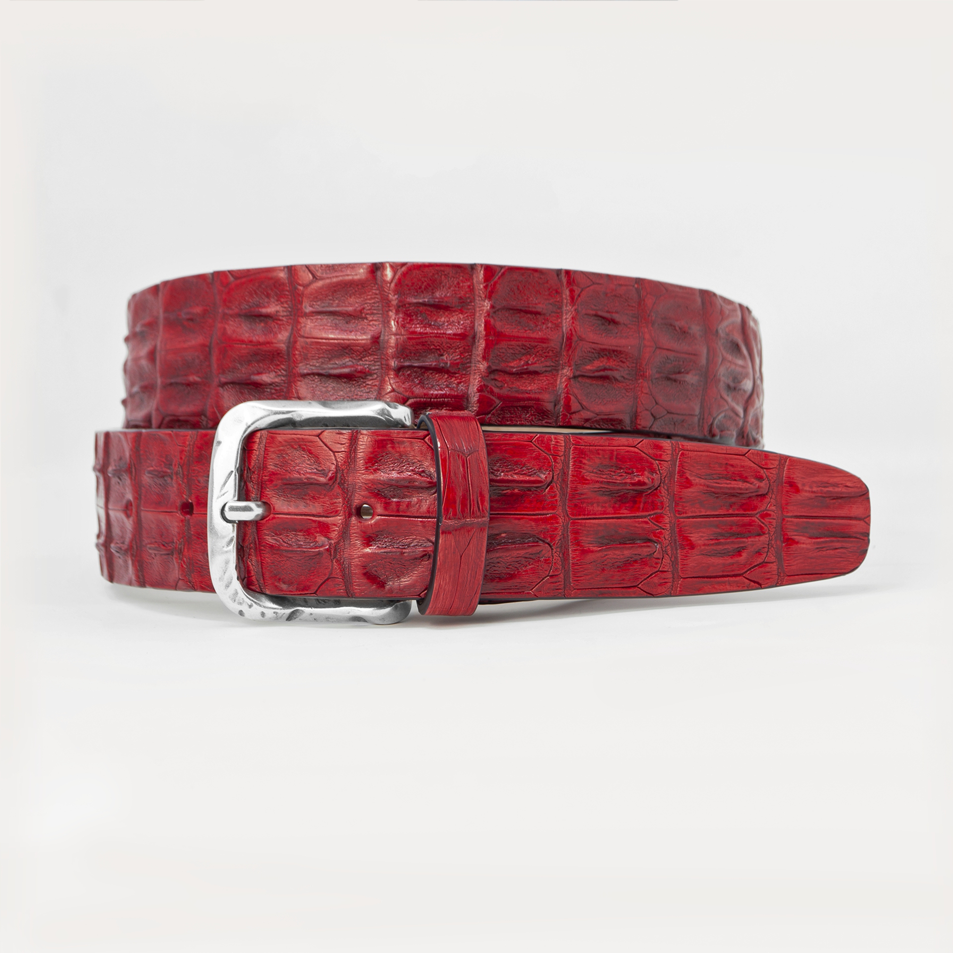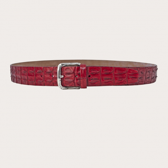 Lässiger Gürtel aus echtem Krokodilleder. Ein Modell, bei dem die Schönheit der Krokodil-Rückenschuppen durch die intensive rote Farbe akzentuiert wird.