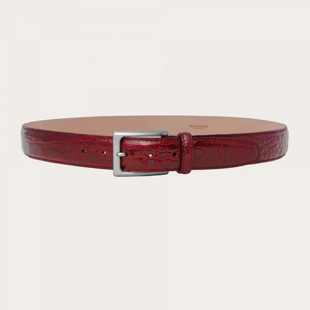 Tauchen Sie ein in den unvergleichlichen Charme dieses Luxusgürtels aus echtem rubinfarbenem Krokodilleder.