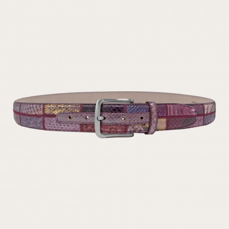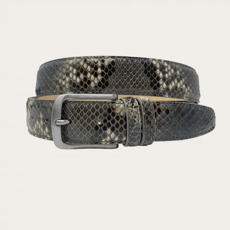 Die Verarbeitung mit Front- und Back-Cut verleiht diesem handgefertigten Python-Gürtel Eleganz und Raffinesse, abgerundet durch eine satinierte Messingschnalle in Silberoptik.