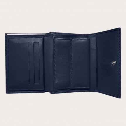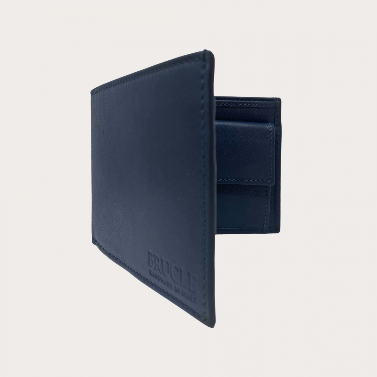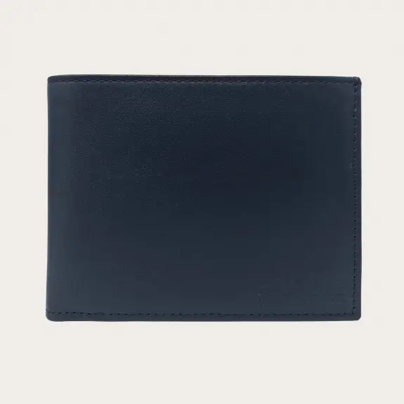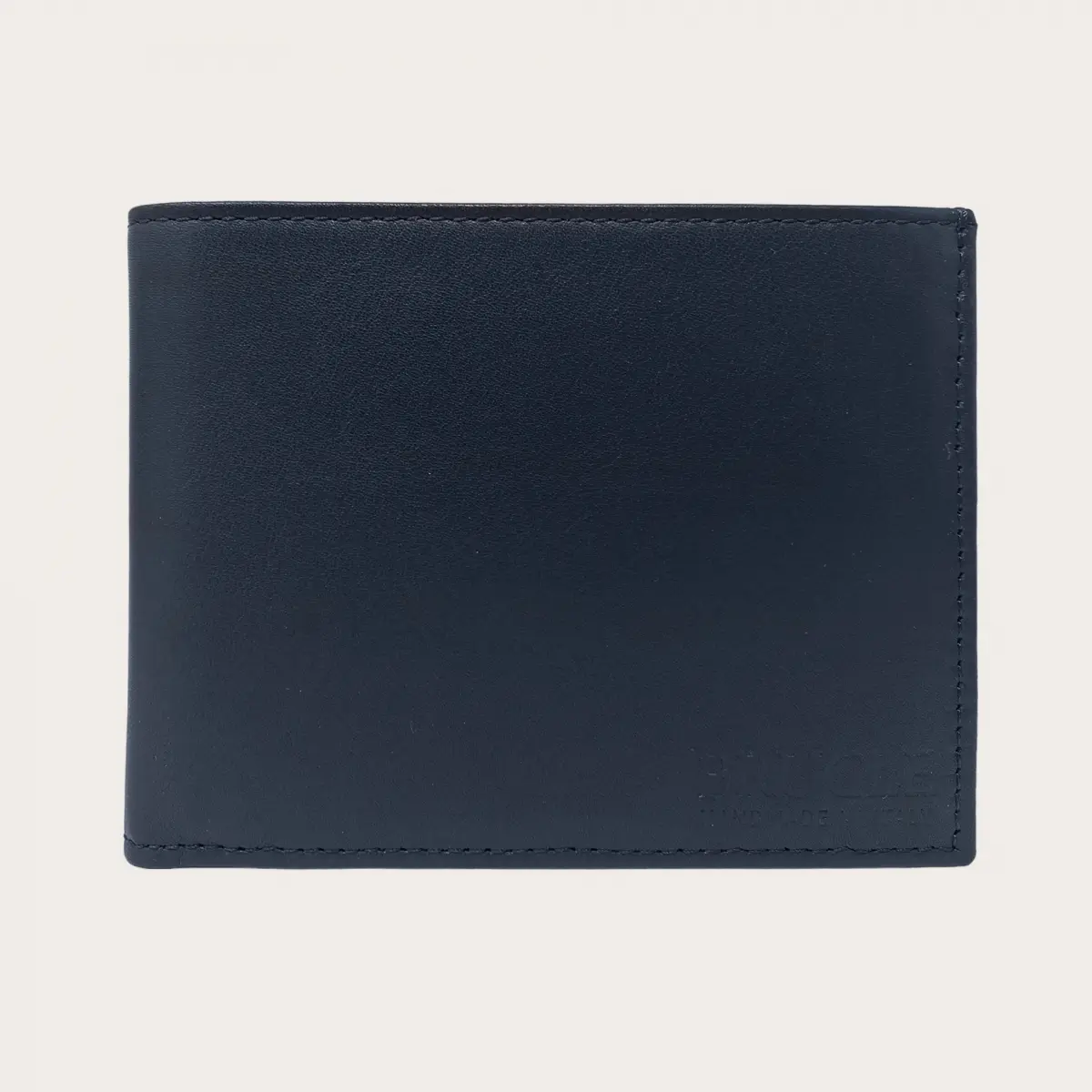 Herrenbrieftasche in Marineblau, horizontales Format, ausgestattet mit Fächern für Kreditkarten, Dokumente und einem Münzfach. Ein klassisches und praktisches Modell, mit Fächern für Kreditkarten, einem Münzfach mit Knopfverschluss, Taschen für Dokumente und zwei Fächern für Banknoten.