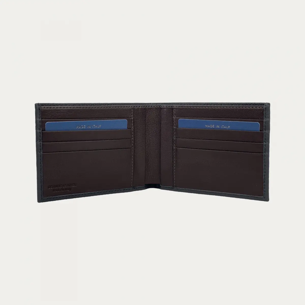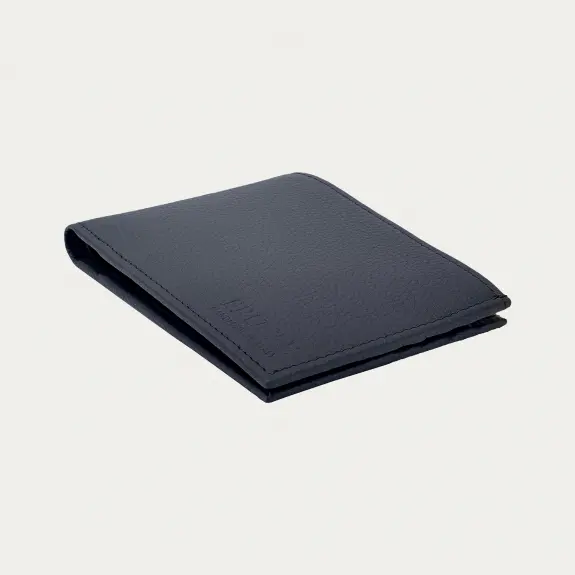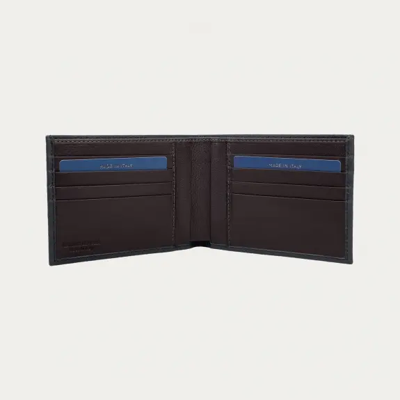 Das Herrenportemonnaie aus weichem, blauen genarbten Leder mit kontrastierendem braunem Innenfutter ist das perfekte Portemonnaie für diejenigen, die einen einzigartigen Stil suchen.