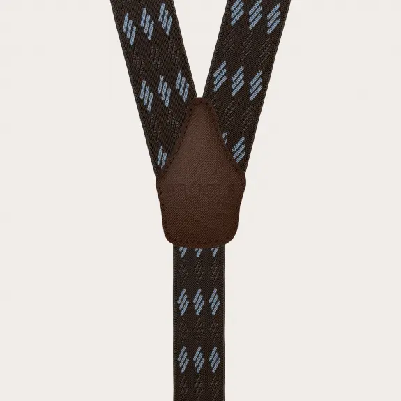 Unisex elastische Hosenträger in Braun mit blauen Streifen und einem passenden Echtleder-Rückenteil in Saffiano-Optik.