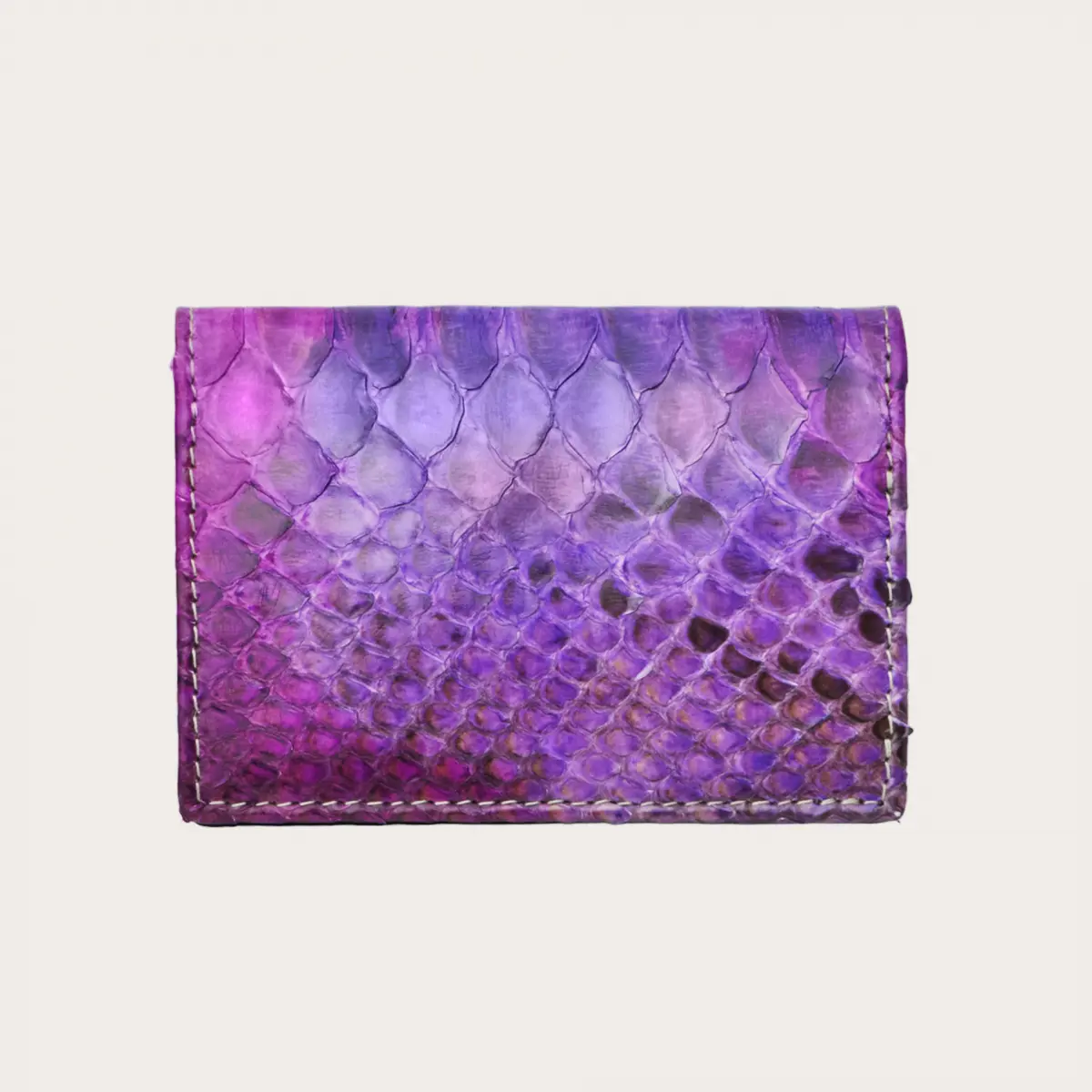 Für die neue Brieftaschenkollektion von BRUCLE, ein Kreditkartenetui-Modell aus raffiniertem, handgepuffertem Pythonleder in Flieder- und Violetttönen, ideal zum Mitnehmen in kleinen Taschen und einfach zu kombinieren, 100 % Made in Italy.