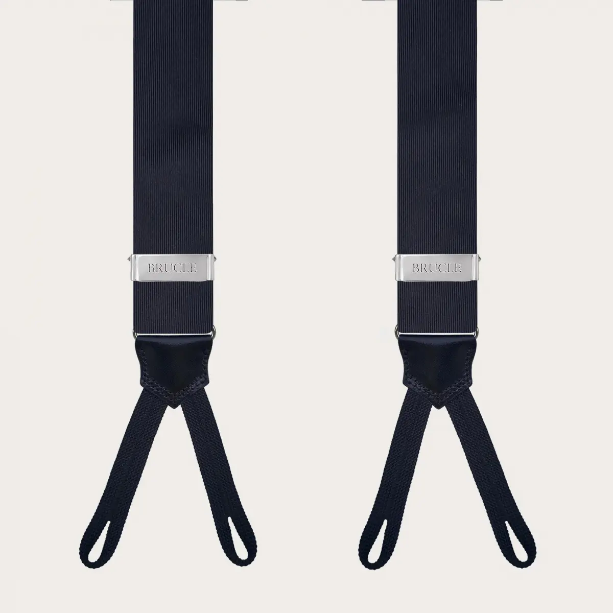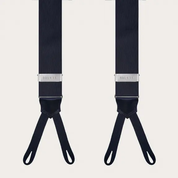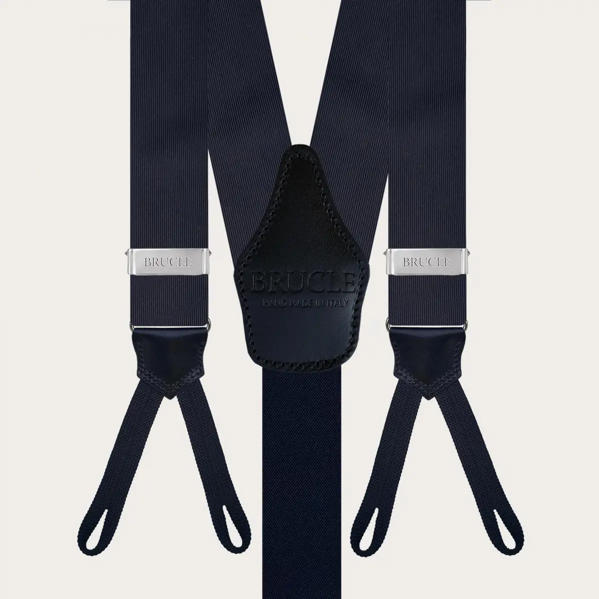 Unsere Hosenträger für Knöpfe mit Schlaufen, in Marineblau, sind ideal für formelle Anlässe, bei denen Sie Stil und Eleganz demonstrieren möchten. Eine klassische und zeitlose Farbe, vielseitig kombinierbar. 100% Made in Italy, diese Seidenhosenträger für Knöpfe werden mit Sorgfalt und Leidenschaft aus den feinsten Materialien hergestellt: von reiner 74-Faden-Seide aus Como gewebt, zu pflanzlich gegerbten Lederteilen, zu nickelfreien Metallteilen.