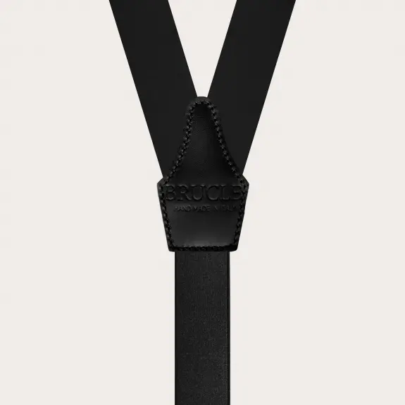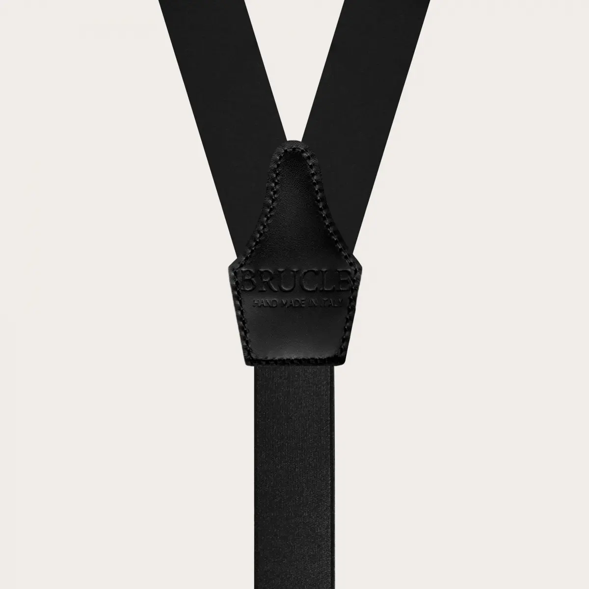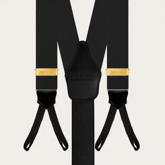 Unsere schwarzen Seidensatin-Hosenträger mit Knopflöchern sind das perfekte Accessoire für elegante Veranstaltungen, auch dank der goldenen Metallteile, die einen luxuriösen und wertvollen Akzent setzen.