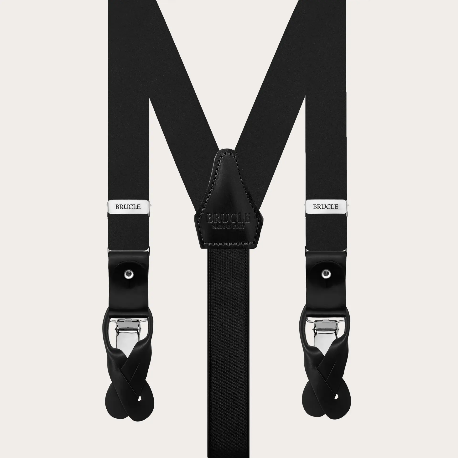 Elegante schwarze Seidensatin Herrenhosenträger mit Doppelnutzung, für Knöpfe oder mit Clips. Ein vielseitiges Modell, hergestellt aus den feinsten in Como gewebten Seiden.