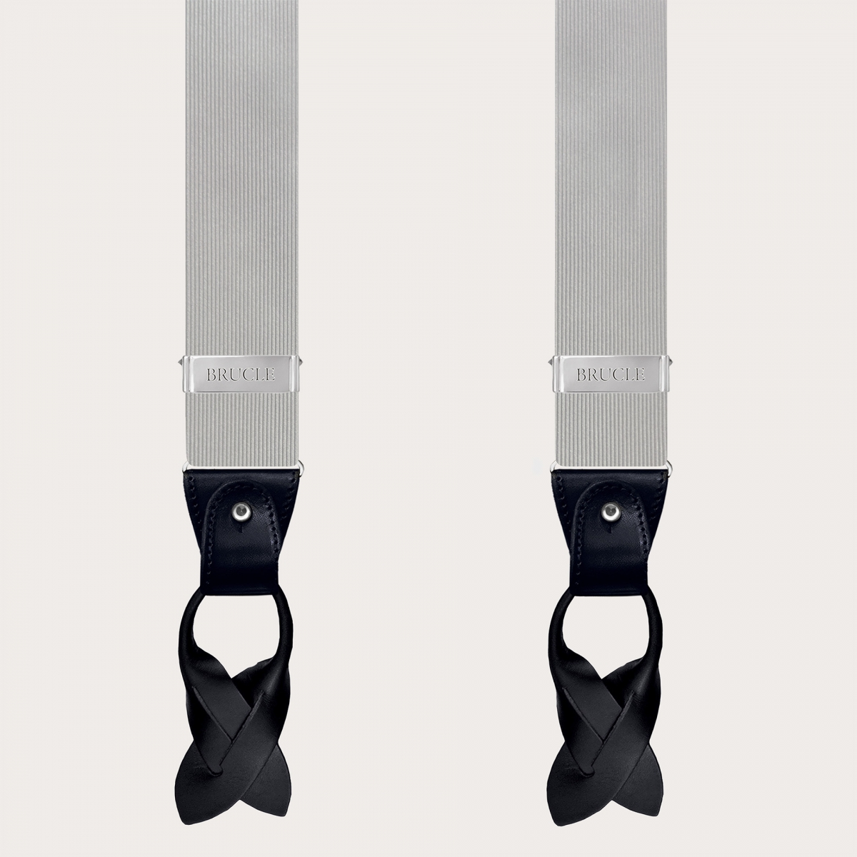 Raffinierte Hosenträger für Herren aus grauer Seide mit kontrastierenden schwarzen Lederteilen.