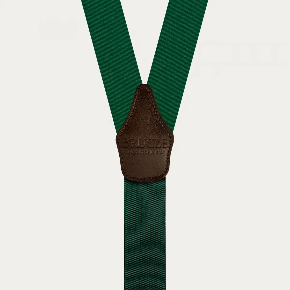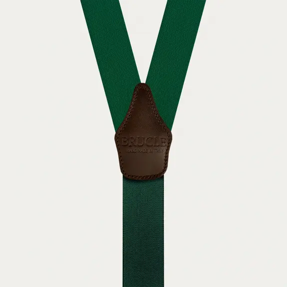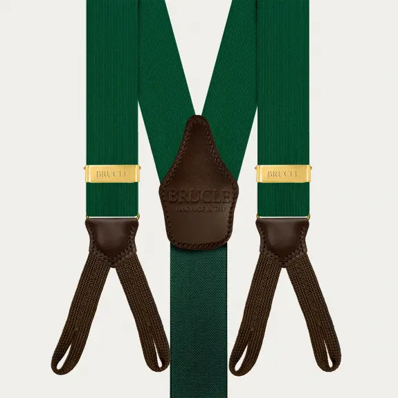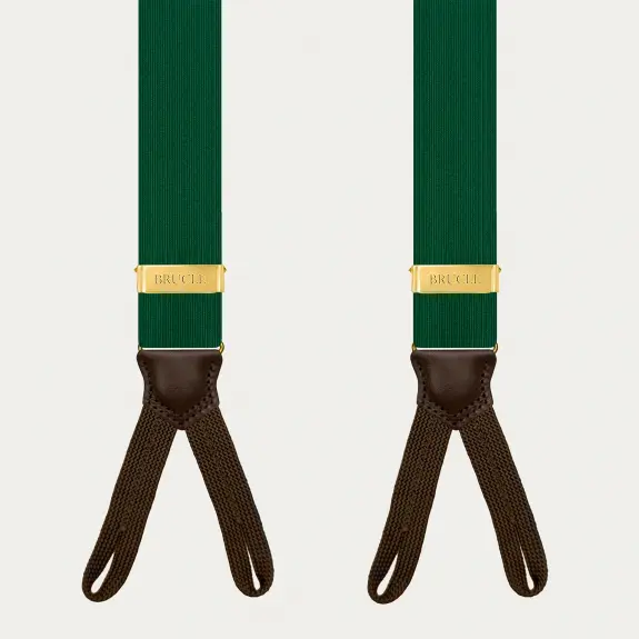 Elegante grüne Hosenträger aus Seide mit Knopflöchern, ein einzigartiges Accessoire, bereichert durch kontrastierende dunkelbraune Lederdetails.