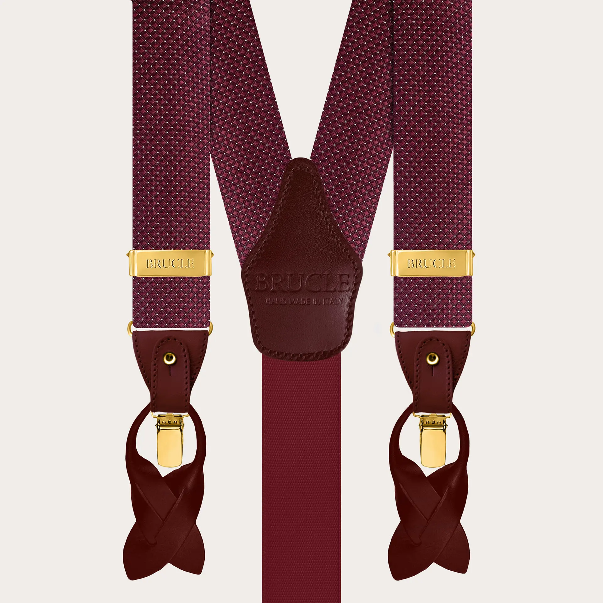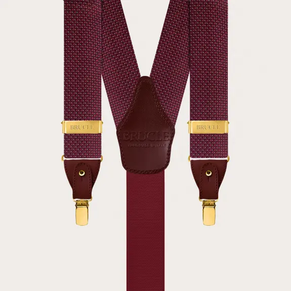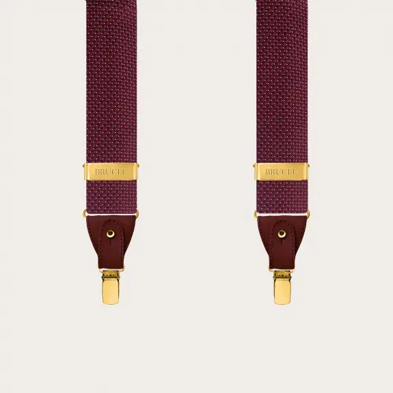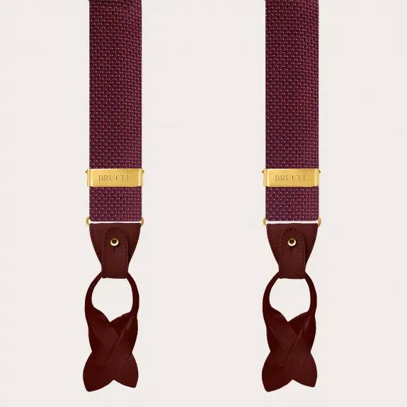 Herren-Hosenträger aus burgunderroter Seide mit Punktmuster, Knöpfen und Clips in Gold