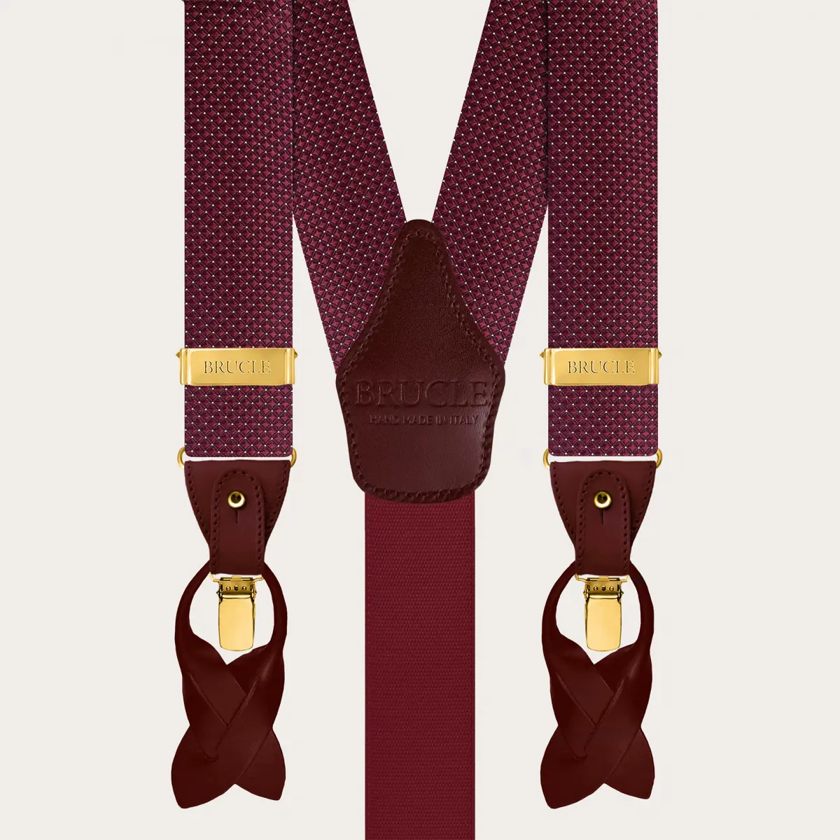 Dank der aufklappbaren Lederschlaufen sind sie sehr vielseitig und können je nach Stilbedürfnis mit Lederknopfverschlüssen oder alternativ mit Clips verwendet werden. Und für ein perfektes Ensemble sind sie zusammen mit passenden Fliegen oder Krawatten, sowohl breit als auch schmal, in abgestimmter Seide erhältlich, für einen eleganten Gesamteindruck. Entdecken Sie die handgefertigten Seidenhosenträger von BRUCLE, handgefertigt in Italien mit den besten Materialien und größter Sorgfalt für jedes Detail.