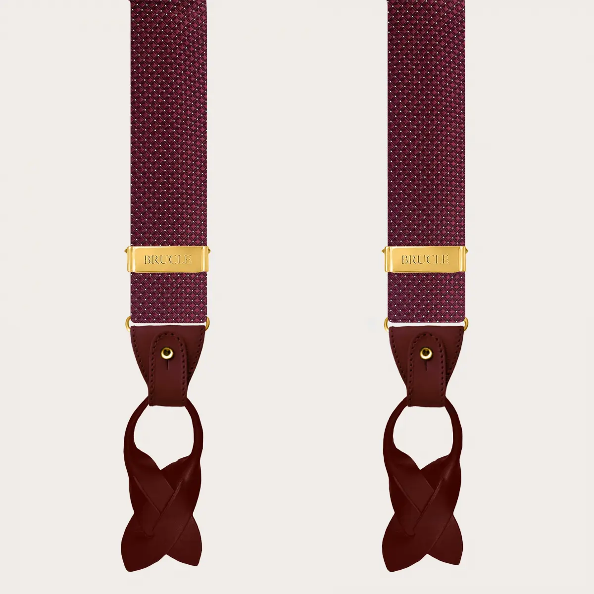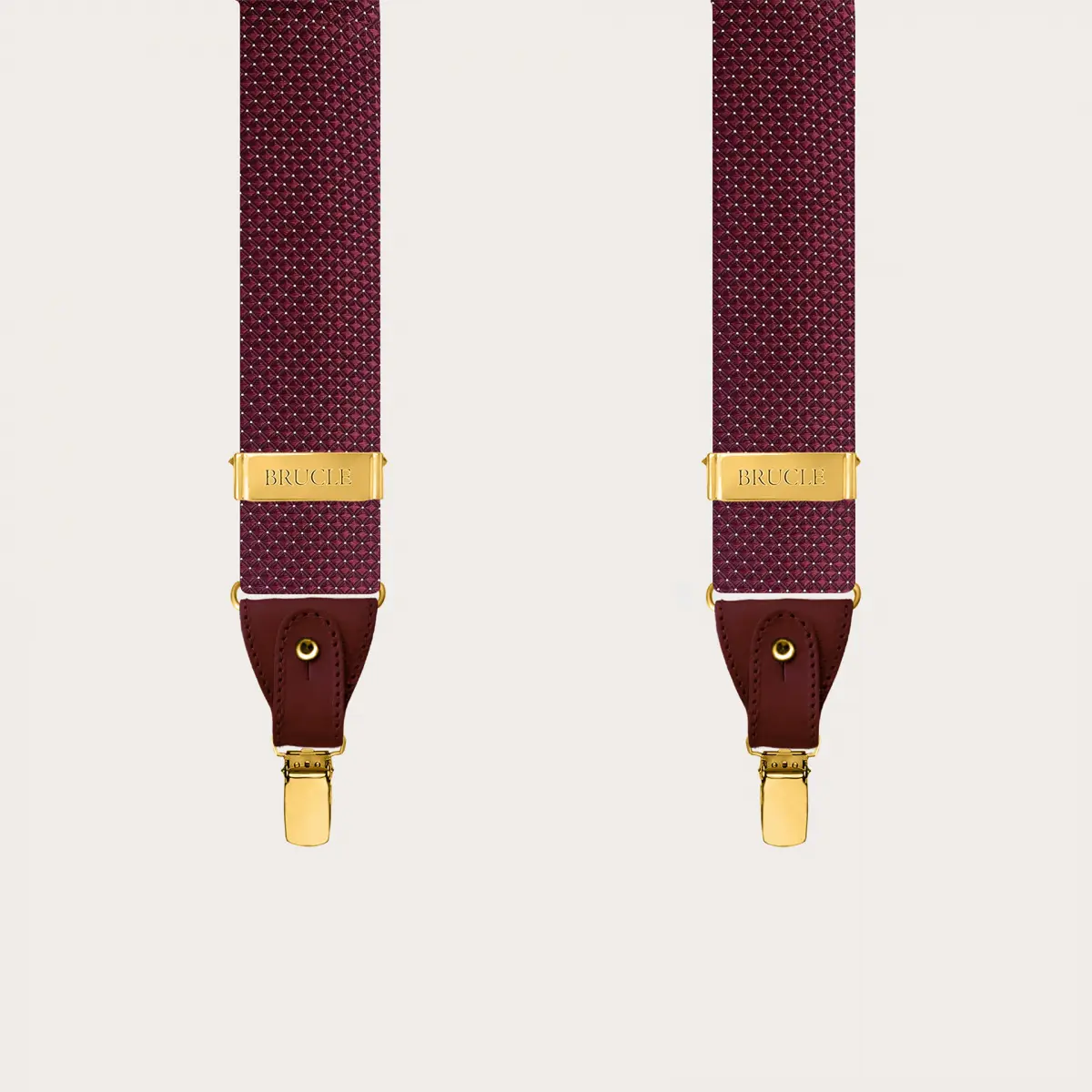 Exklusive Herren-Seidenhosenträger in Burgunderrot mit Punktmuster, veredelt mit goldenen Metallteilen, die diesen handgefertigten Hosenträgern zusätzliche Raffinesse und Luxus verleihen. Praktisch und vielseitig, können sie mit Knöpfen oder alternativ mit Clips getragen werden, was sie besonders für Feiern und formelle Looks geeignet macht. Personalisierbar mit Gravuren.