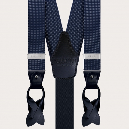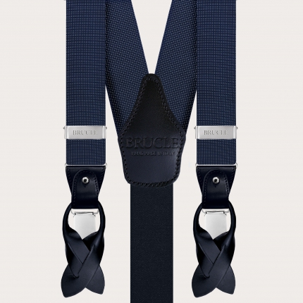 Herren Hosenträger in blau bedruckter Seide, gefertigt mit einem ausgeprägten Paisley Makromuster. Dieses einzigartige und raffinierte Design passt problemlos zu verschiedenen Outfits und eignet sich ideal für formelle Anlässe und Zeremonien. Mit einem vielseitigen System können sie entweder mit Clips oder Knöpfen getragen werden.