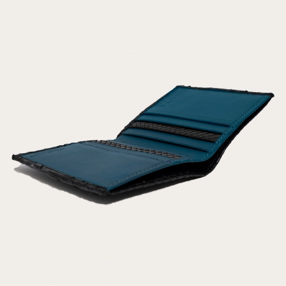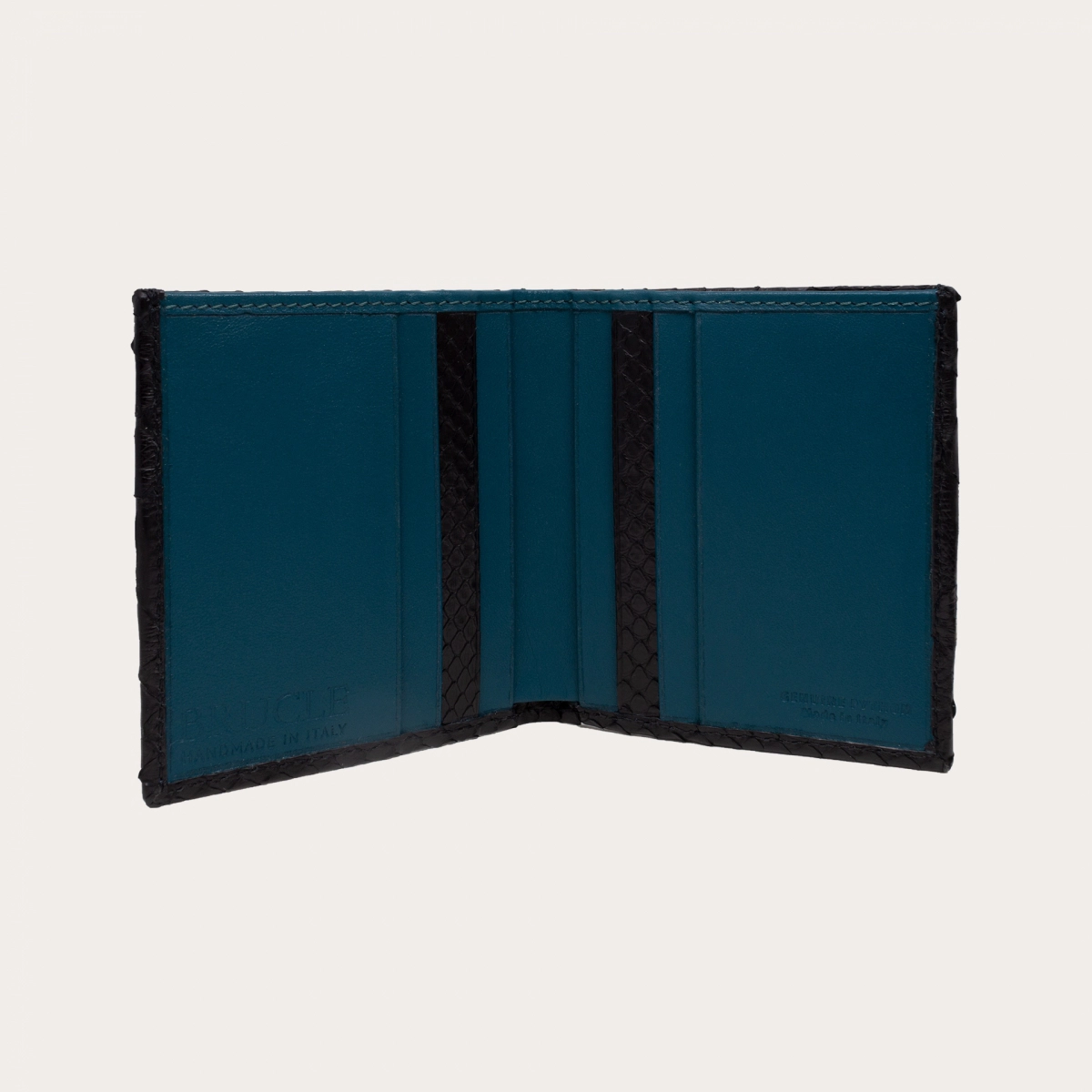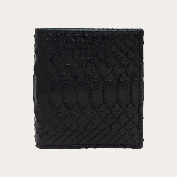 Black compact wallet, with coin purse, in genuine python leather. The color enhances the beauty of exotic leather, the contrasting interior makes it original and trendy. A practical and versatile model, a convenient alternative to more bulky wallets.