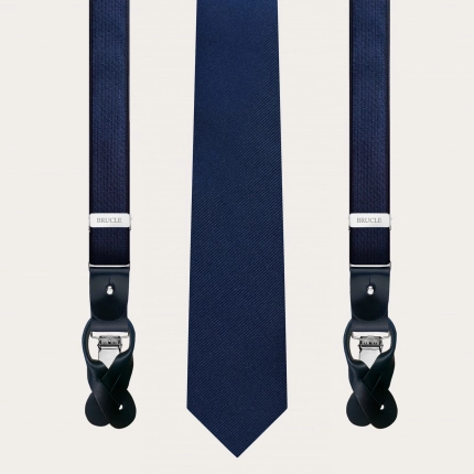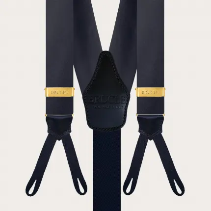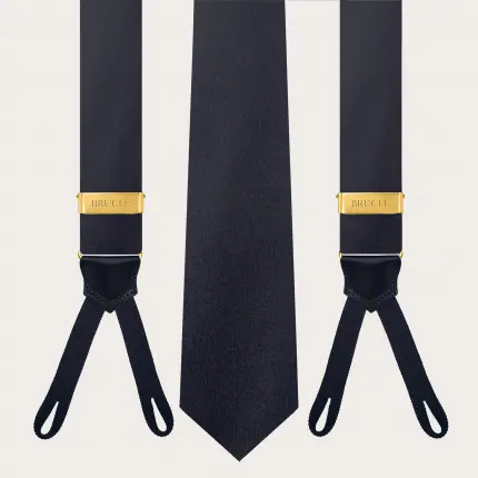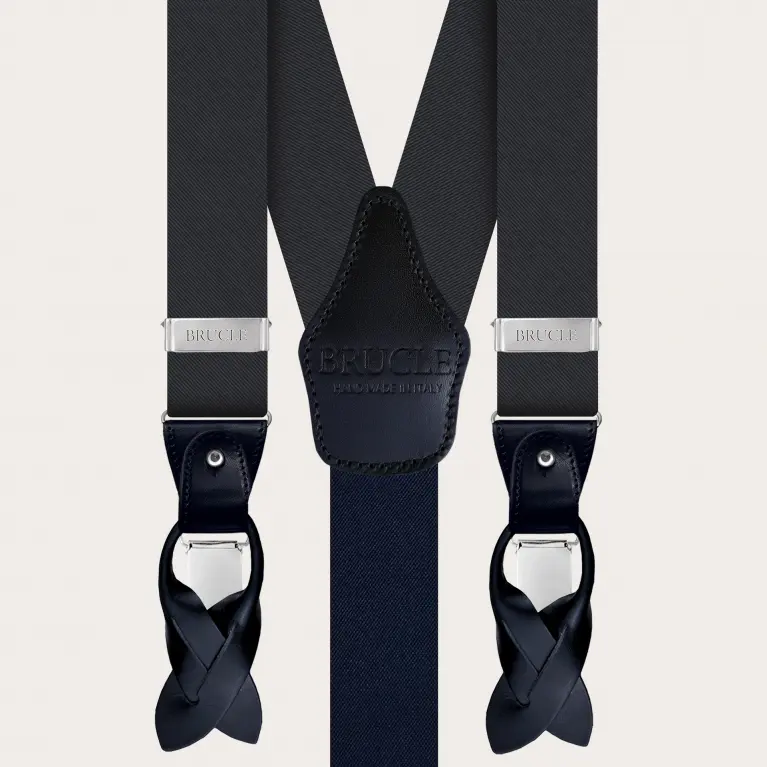 The wide red suspenders in silk are versatile and can be worn with buttons or clips.