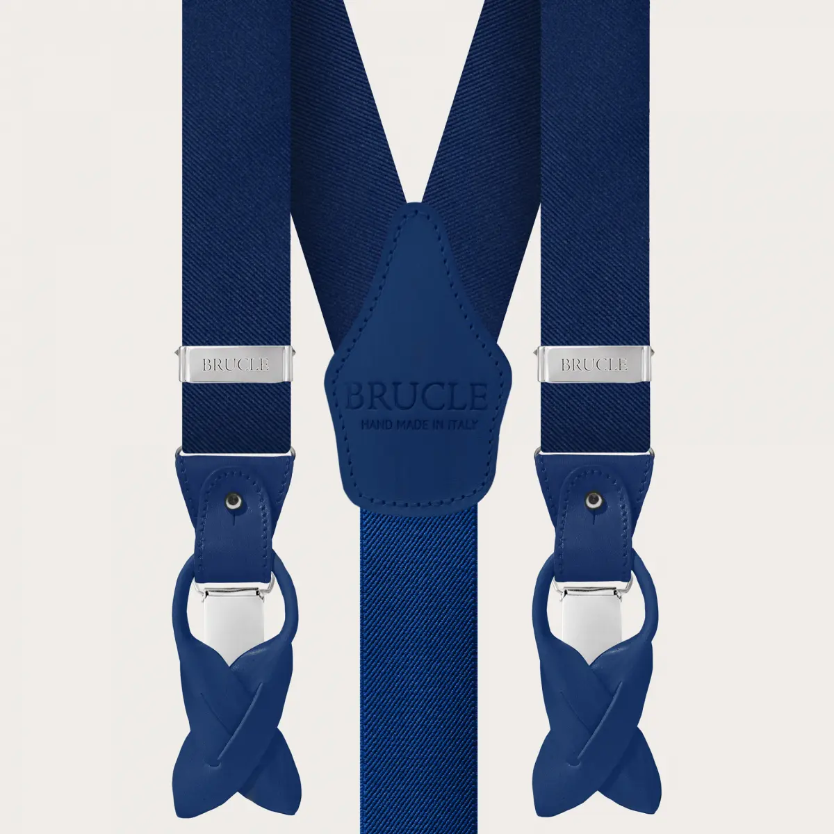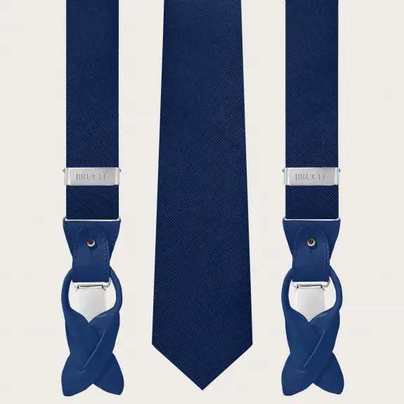 Discover the coordinated set of silk suspenders and tie in blue from Brucle, the elegant and refined accessory perfect for ceremonies and your special events.
